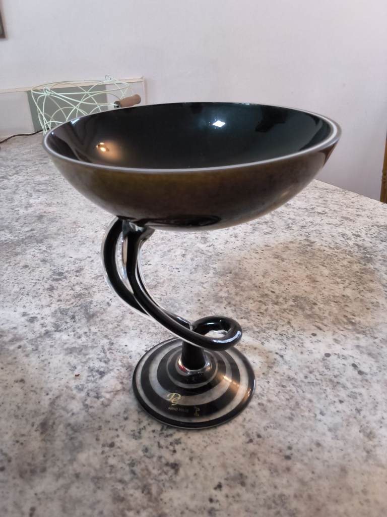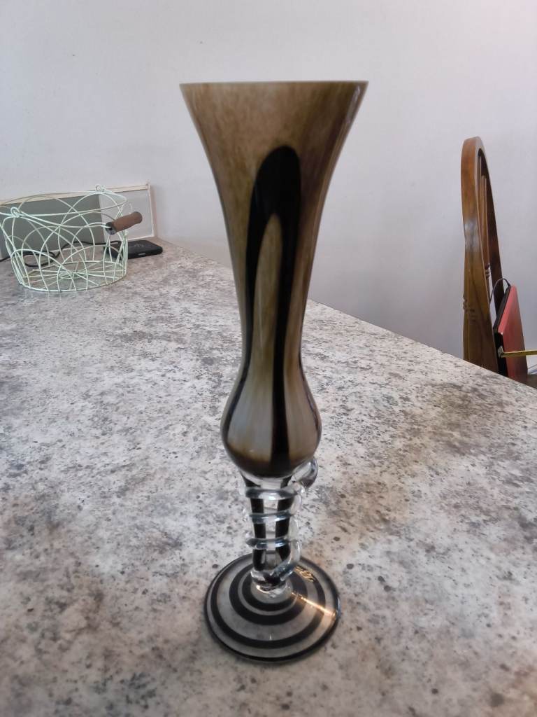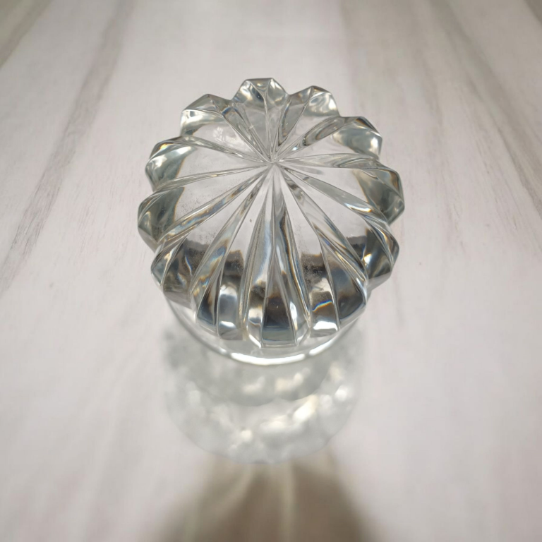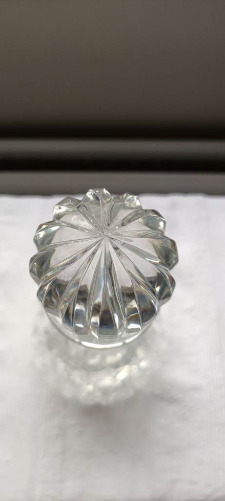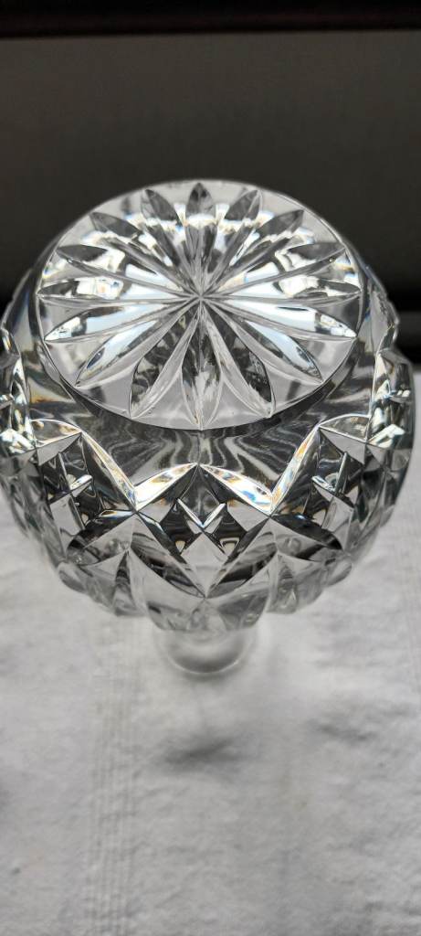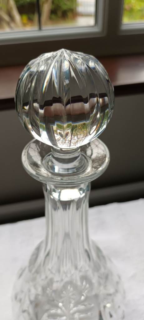 This round decanter features a decorative stopper which is typical of the late 20th Century production style of cut glass. This decanter is approx 35+ years old & has never been used. The base has a beautiful flower design, the neck of the decanter is fluted and has a round stopper with a flower design. Never used, no chips or flaws. Still boxed, but the box shows signs of age due to being stored away. Been stored in a dry protective atmosphere