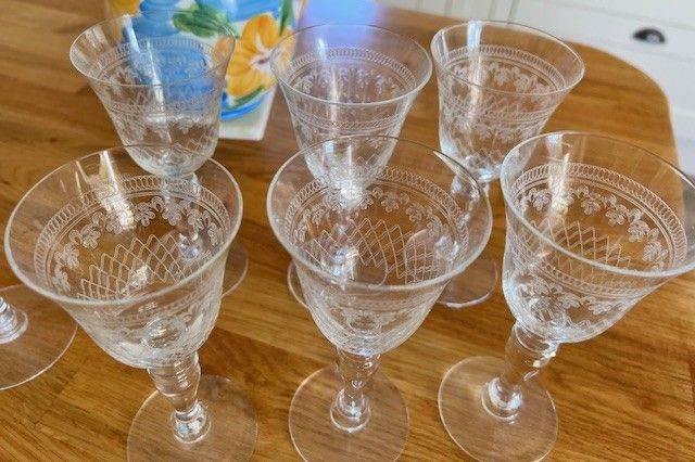 Set of 6 rare delicate vintage wine glasses with a bonus two claret glasses all matching with no defects or chips etc. See photos for style and design. Unwanted heirloom available for sale. Buyer collects or can deliver within a reasonable distance around Nairn.