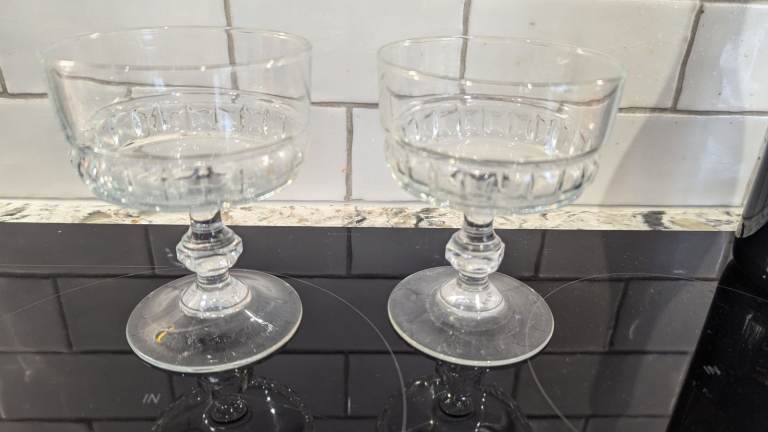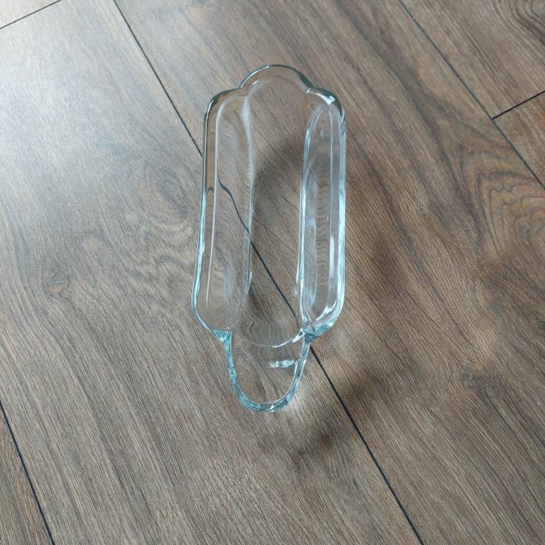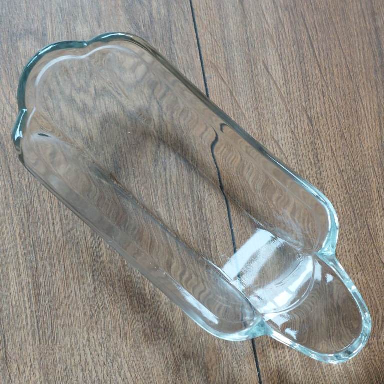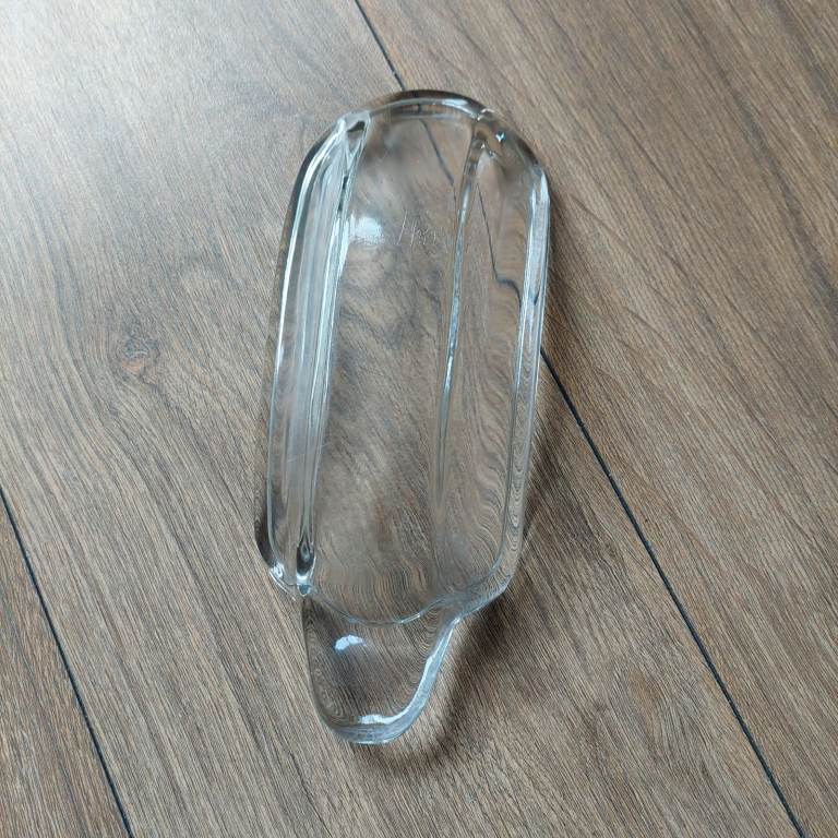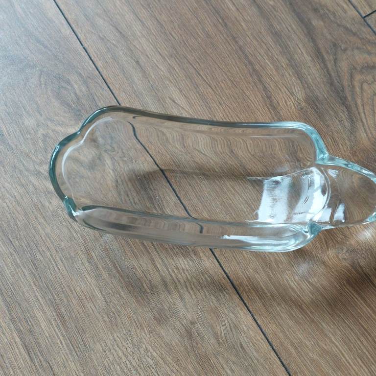 Vintage serving glass boat shape with thumb carrying peice thick glass no chips no scratches in hood condition .
