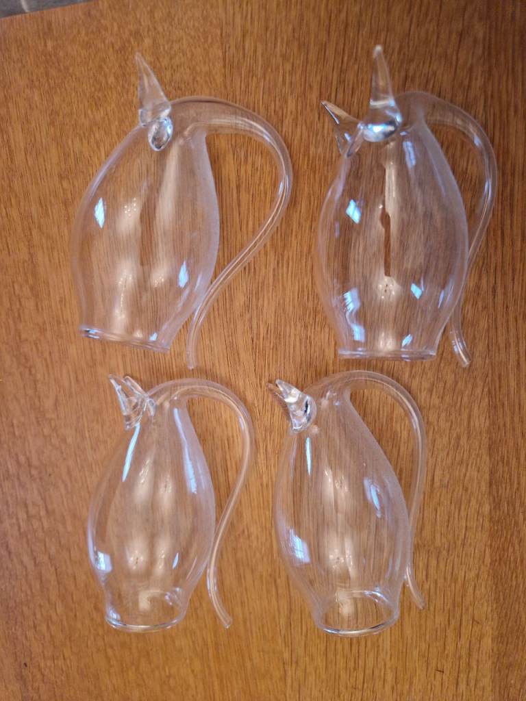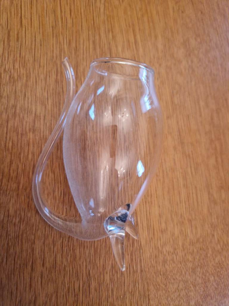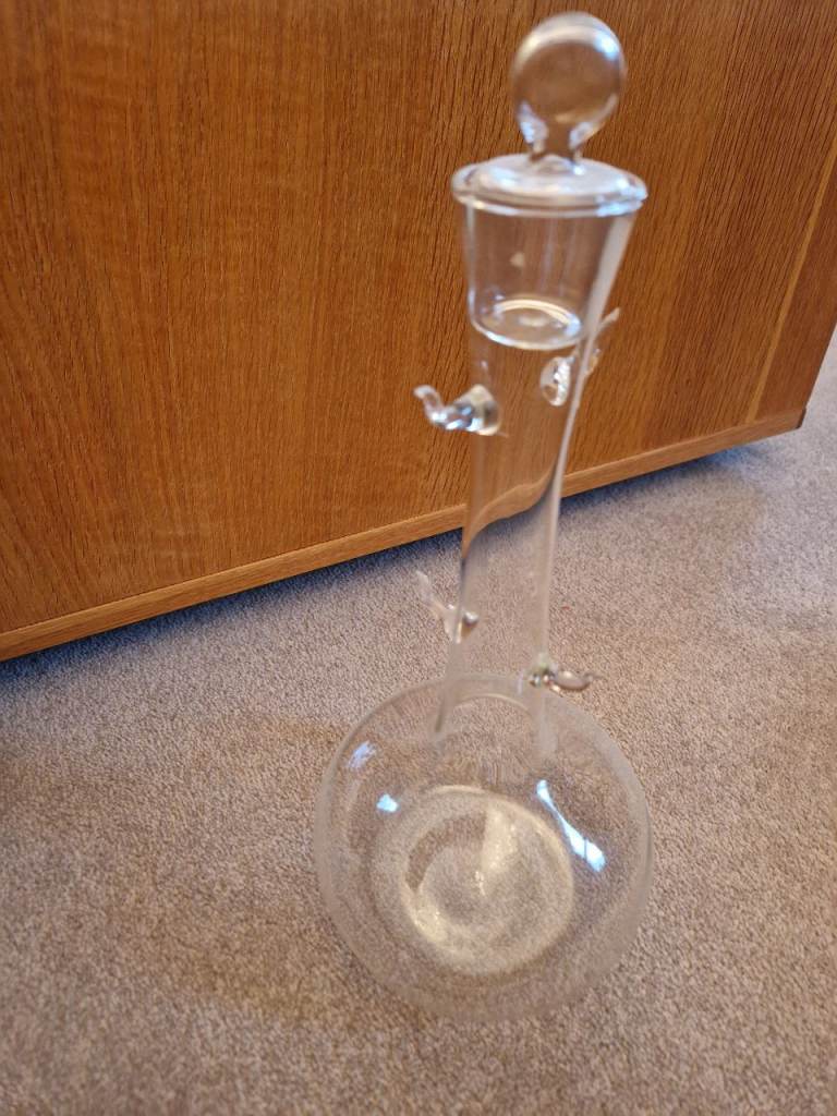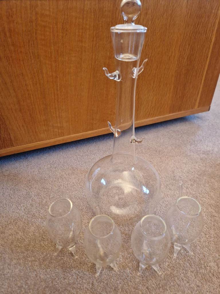 Delicate glass decanter with 4 "snifter" glasses. You can drink from the top or from the spout.