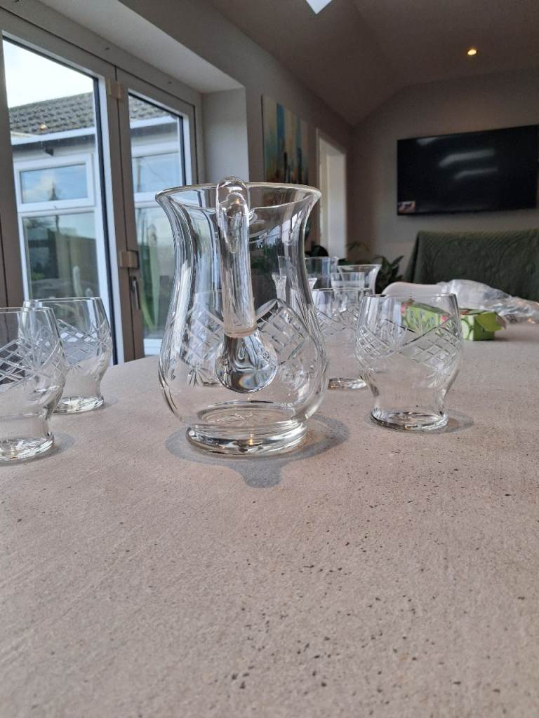 Really lovely cut glass jug with 5 matching pattern glasses. Jug is 7 inch high and the glasses are 4 inch high. I live in Coates PE7 2DL not Peterborough town.