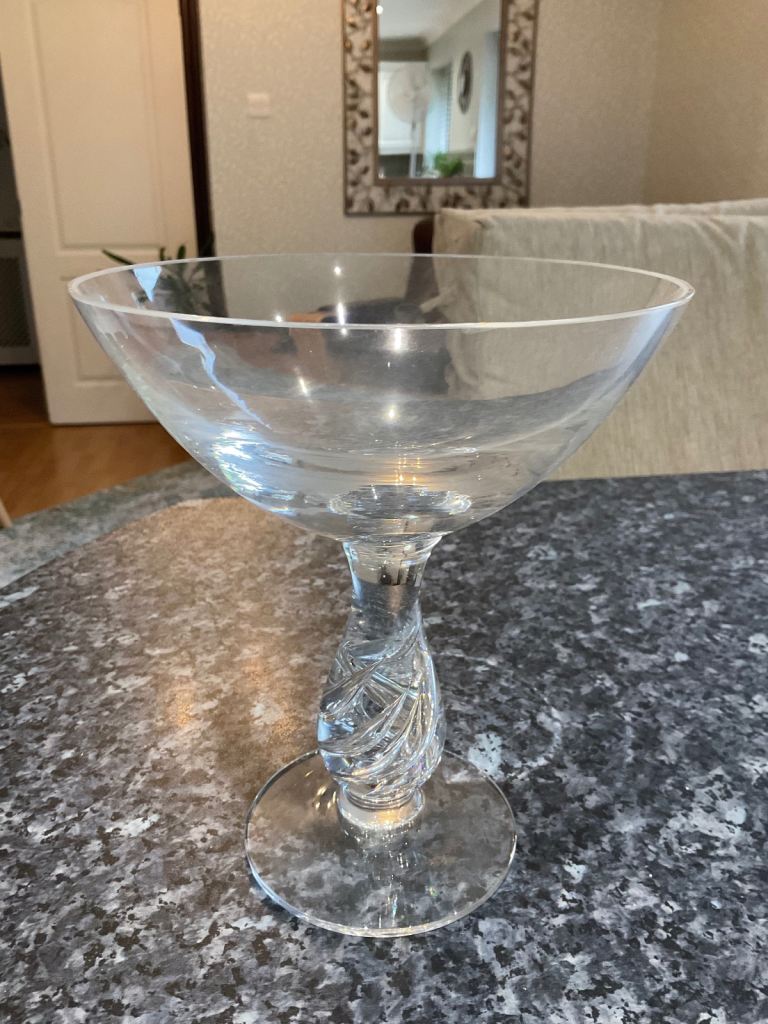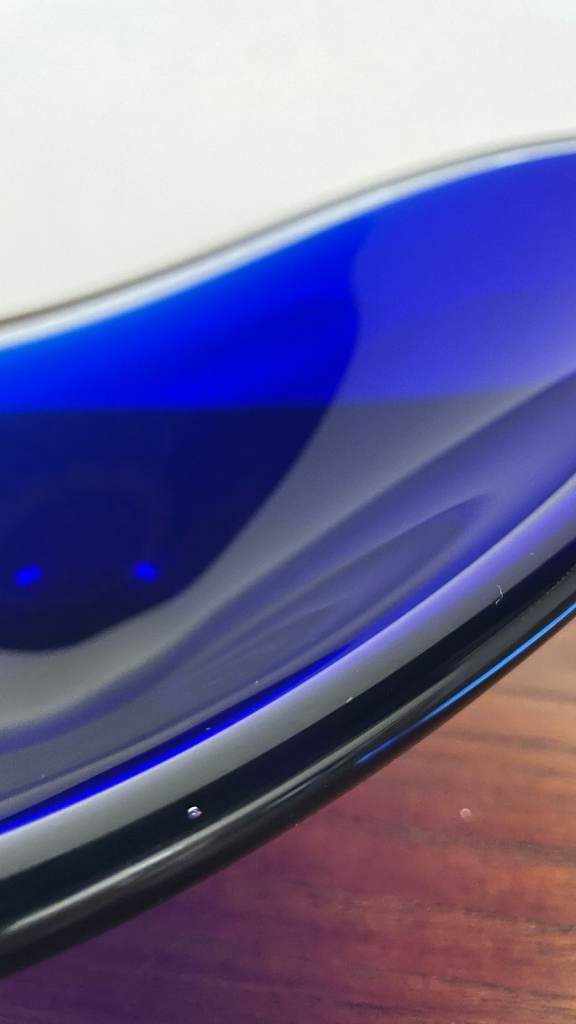 The rich cobalt blue glass gives the dish real presence and depth, especially when displayed in natural light. It measures 29cm wide and 14cm high, making it a substantial yet elegant addition to any room.