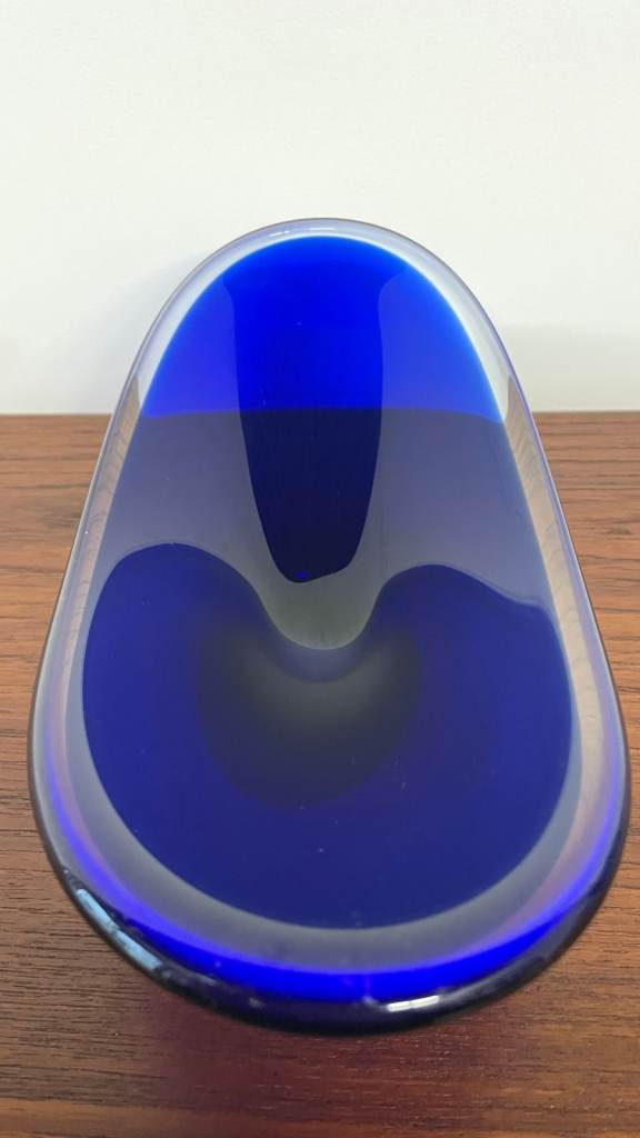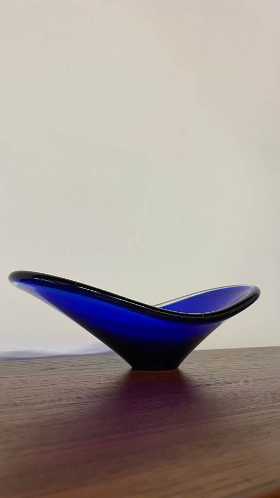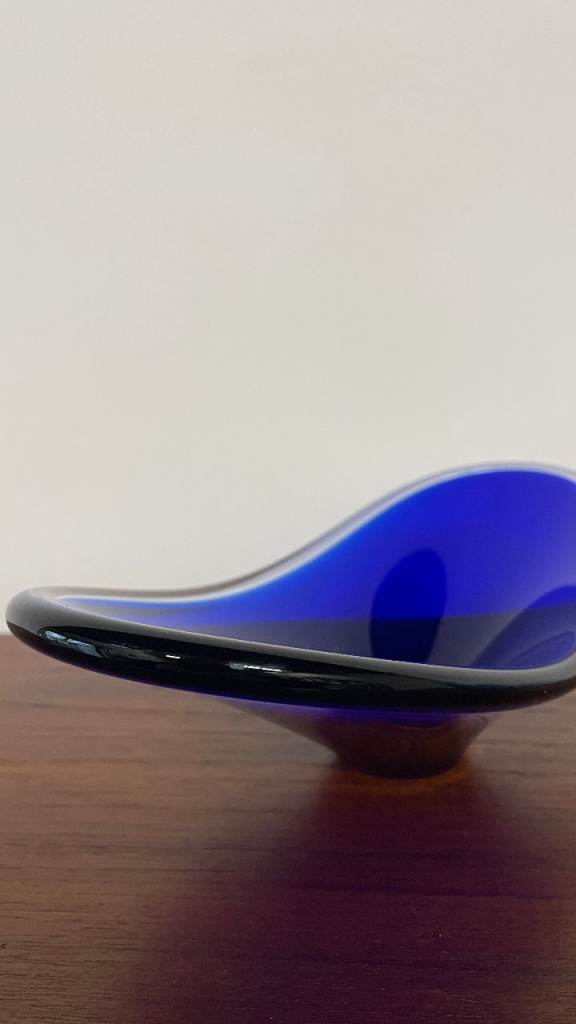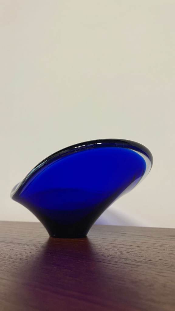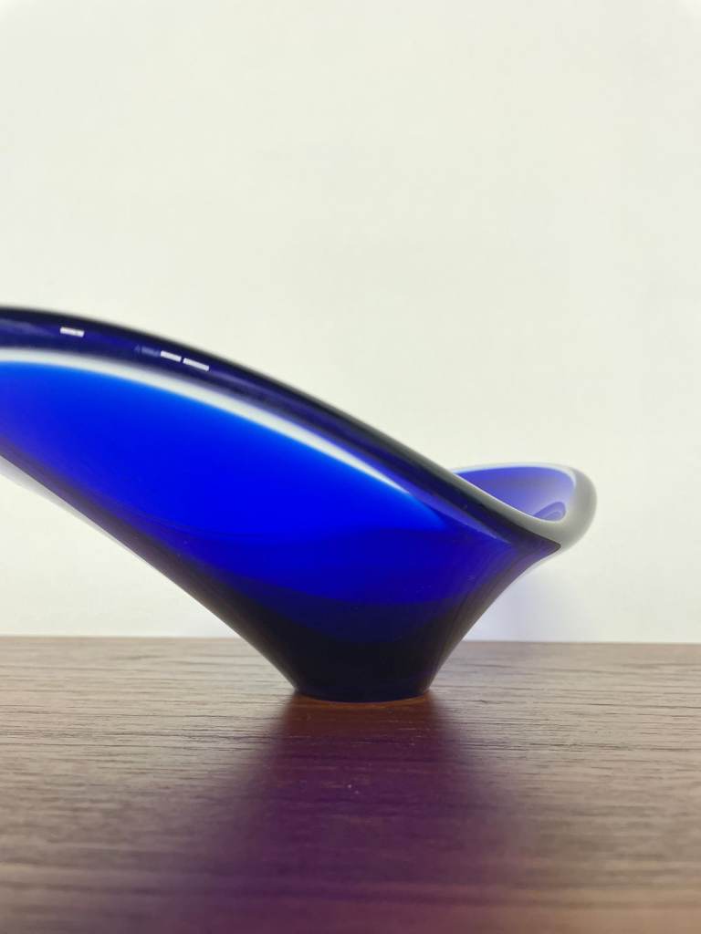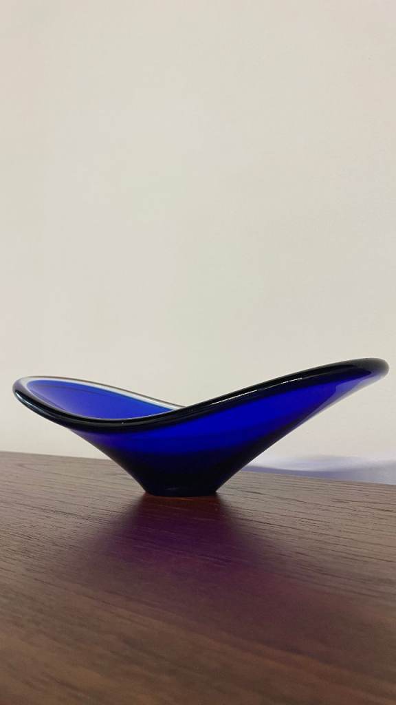 For sale is a stunning mid-century blue art glass dish with a sculptural, organic form. Featuring a sweeping asymmetrical rim and pedestal base, this piece is both decorative and functional, ideal as a centrepiece or display bowl.
