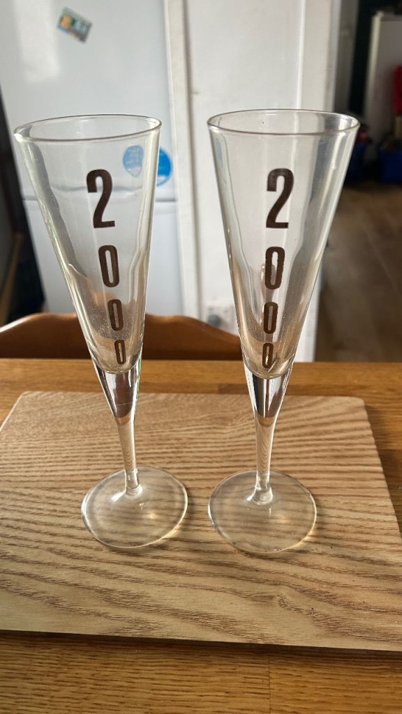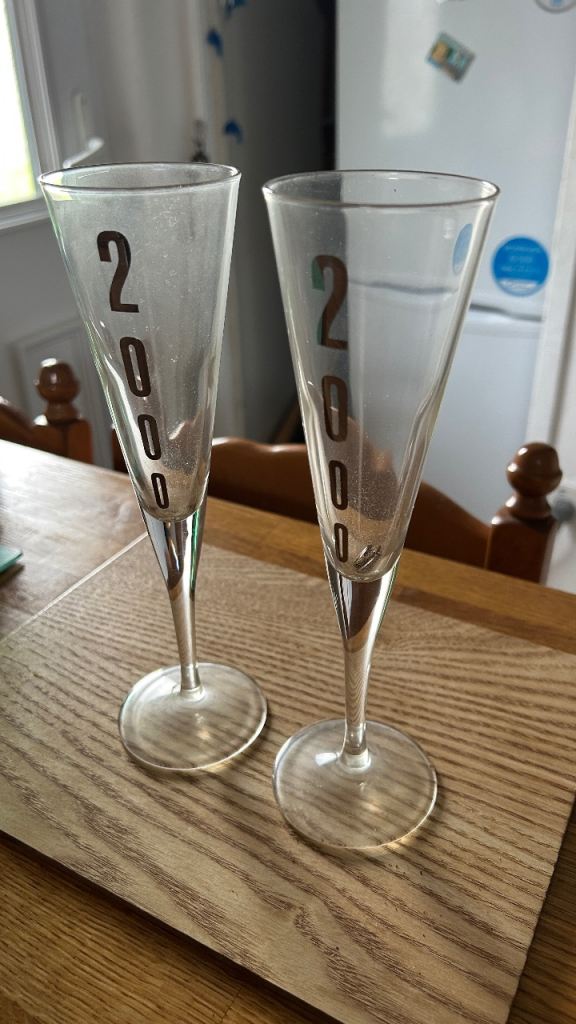 Vintage Millennium Champagne Flutes X 2 Silver Writing 2000 in good condition. Pick up from G73.