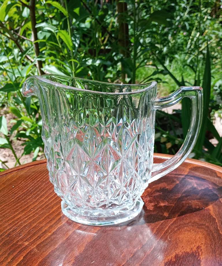 This is a gorgeous Antique / Vintage Pressed Glass Jug in a cut glass style with shield shaped handle. Very Heavy glass. Lovely to serve your drinks from at summer parties and dinners. This jug has been in my family for a very long time, around 100 years but i'm downsizing can you believe I have 8 jugs. Measurements 15 cm tall and 20 cm across the top spout to handle.