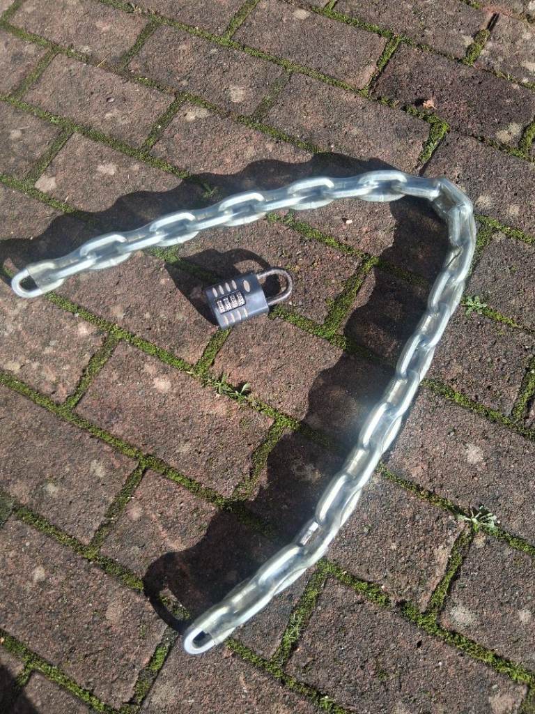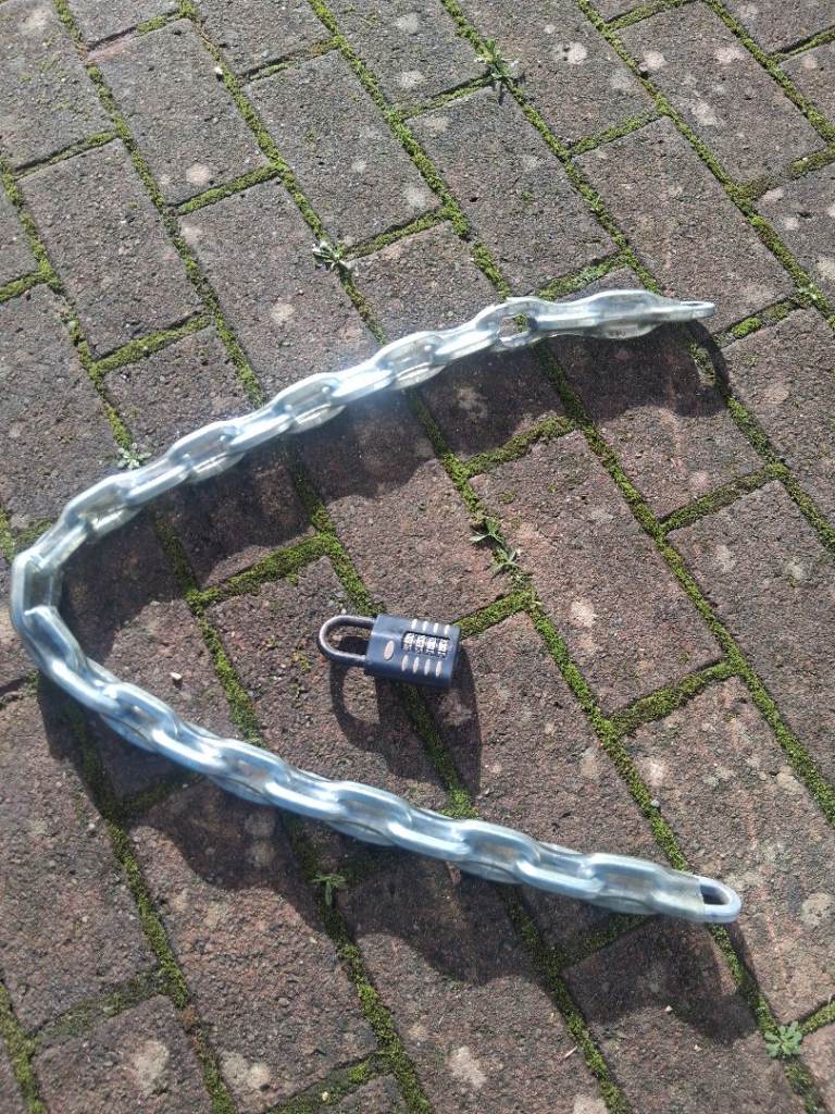 This is quality heavy duty chain in plastic sleeve and combnation lock