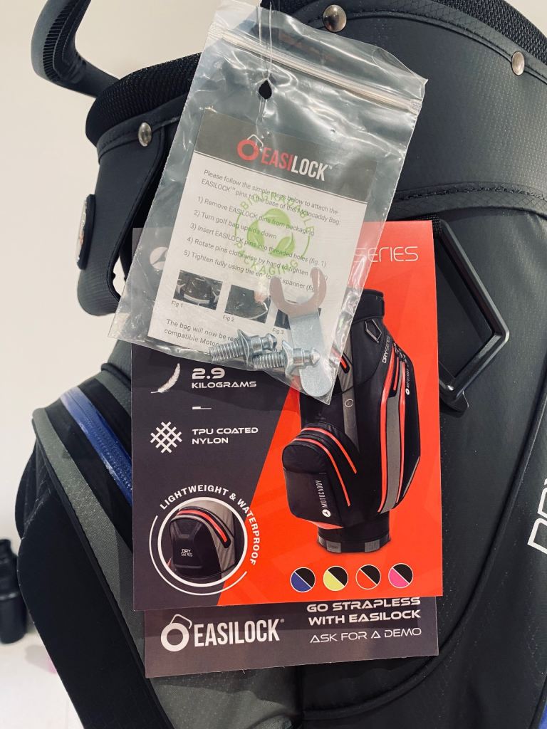 In a ground-breaking first, the exclusive EASILOCK system featured across all new Motocaddy trolleys and bags is designed to lock the cart bag onto the trolley and remove the need for a lower bag strap. Two holes on the trolleys bag support are aligned with two pins on the base of all new Motocaddy cart bags; ensuring golfers can lock their bag onto the trolley before using the upper bag strap to secure it completely. The two pins on the base of each new trolley bag are removable, so golfers have the option of taking them off to fit an older Motocaddy trolley or all other brands of trolley.