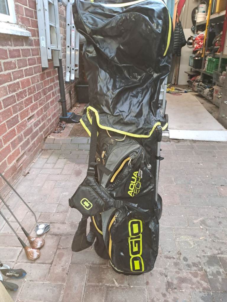 Callaway lightweight golf cart bag, all zips working, multiple main slots for clubs run the full length of the bag, comes with handle, strap rain hood, top handles for easy lifting onto trolley, plenty of storage compartments, large golf ball compartment, fleece lined watch pocket, pen and towel holder, insulated front drinks pocket. One of the bottom seams on back of the bag which faces the trolley, has had a small repair but doesn't affect use, isn't very noticeable and can't be seen when on the trolley. Priced to reflect as these generally sell for upwards of £80. Buyer collects or local delivery for fuel, thanks.