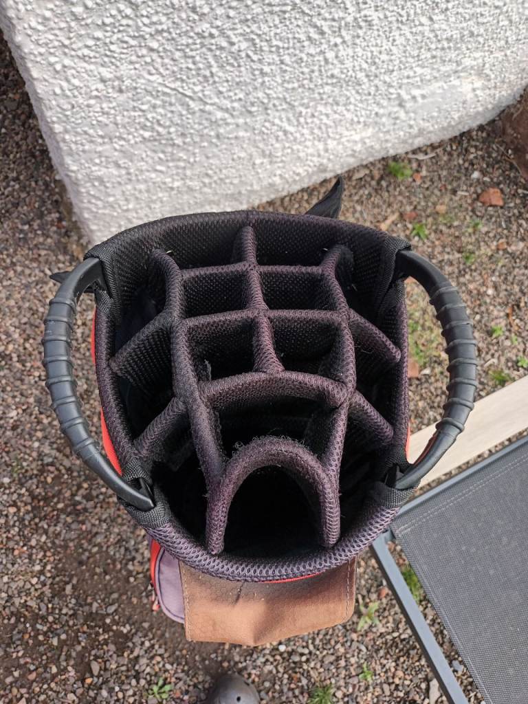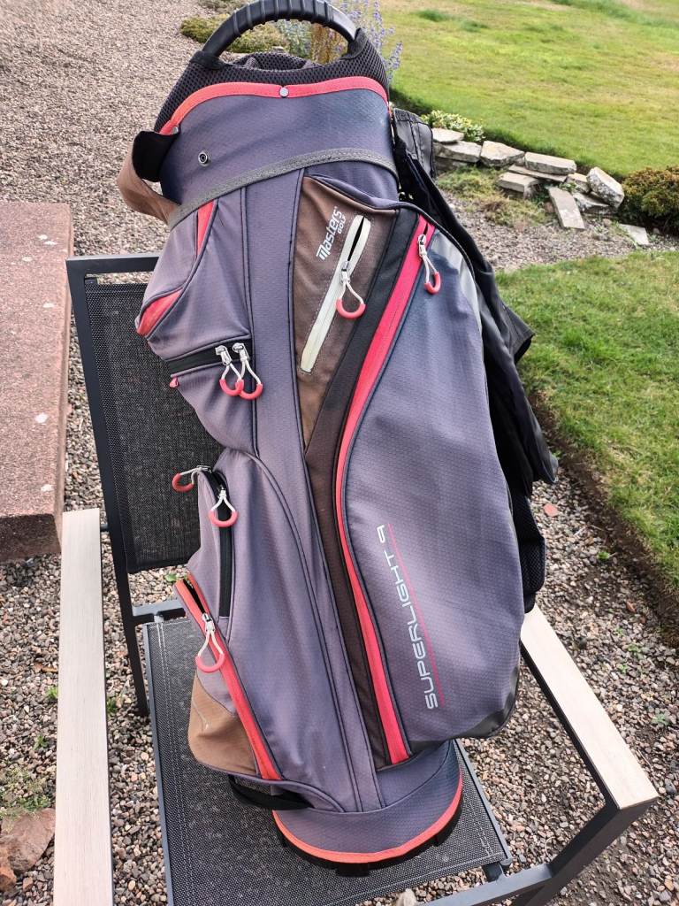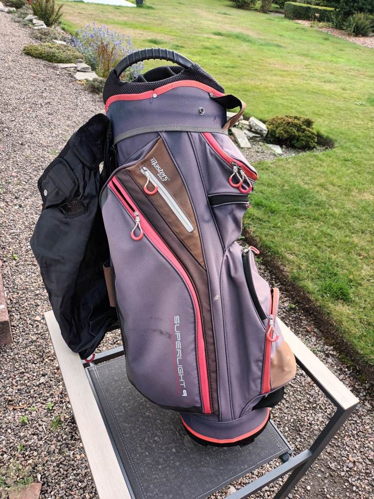 Masters golf trolley cart bag, 14 way divider. All zips work. Colours a wee bit faded. Hood and carry strap included