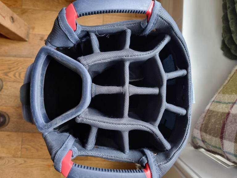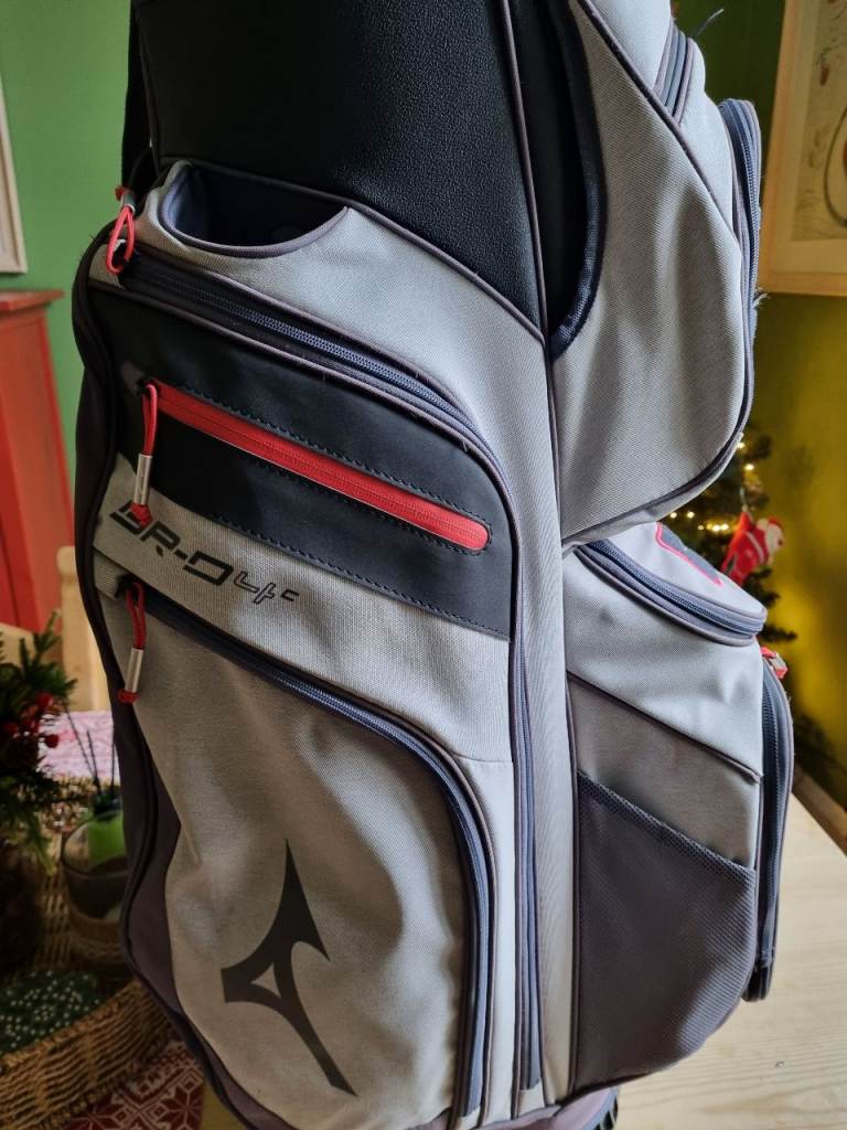 Mizuno BR-D4 trolley bag in excellent condition. Heather grey and blue colour. 14 full length club dividers. loads of pockets with all zips working well. Includes umbrella slot, felt lined valuables pocket with magnetic seal, drinks cooler picker, carry strap, rain hood. This is an excellent golf bag very well designed.