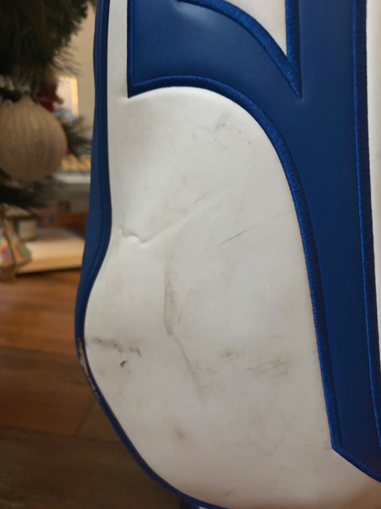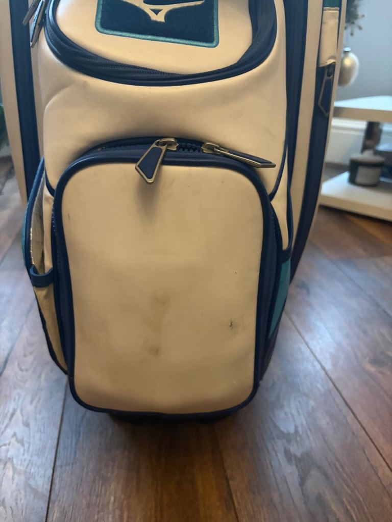 Mizuno cart bag in classic white and blue. Reasonable condition with rain hood.