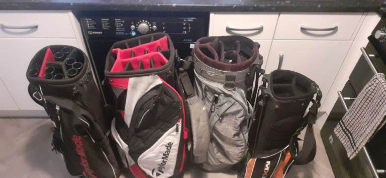 4 golf bags for sale in good condition with all zips pockets working. 3 talylormade, 2 x cart bags, 1 carry bag and 1 kids Dunlop carry bag. Selling as a job lot. Will not sell separately! Pick up only. £50.00 for the lot.