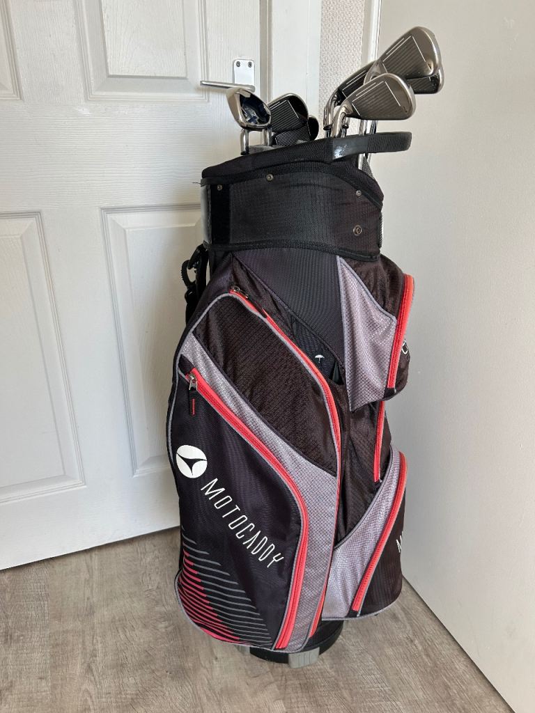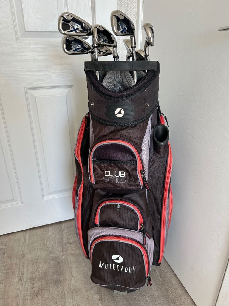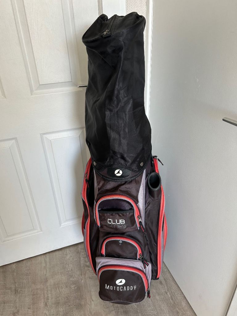 Motocaddy Club Series Golf Cart Bag, 14-way, Black/Grey/Red. The golf bag is also in great condition apart from a tare inside one pocket but no hole. All zips work great, ideal set for a beginner or a keen golfer.... selling for £180 if wanted clubs only £150 or bag only £40 thanks for looking......