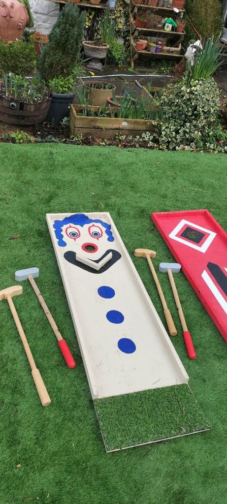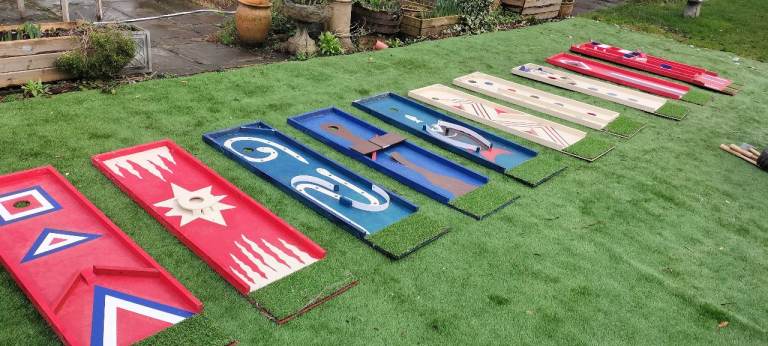 A 10-piece Crazy Golf set, for garden or indoor use. Boards 2m X 0.5 m .