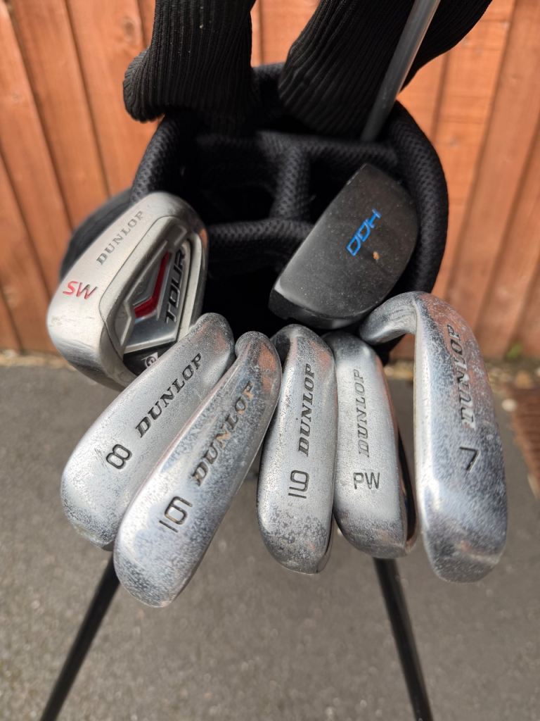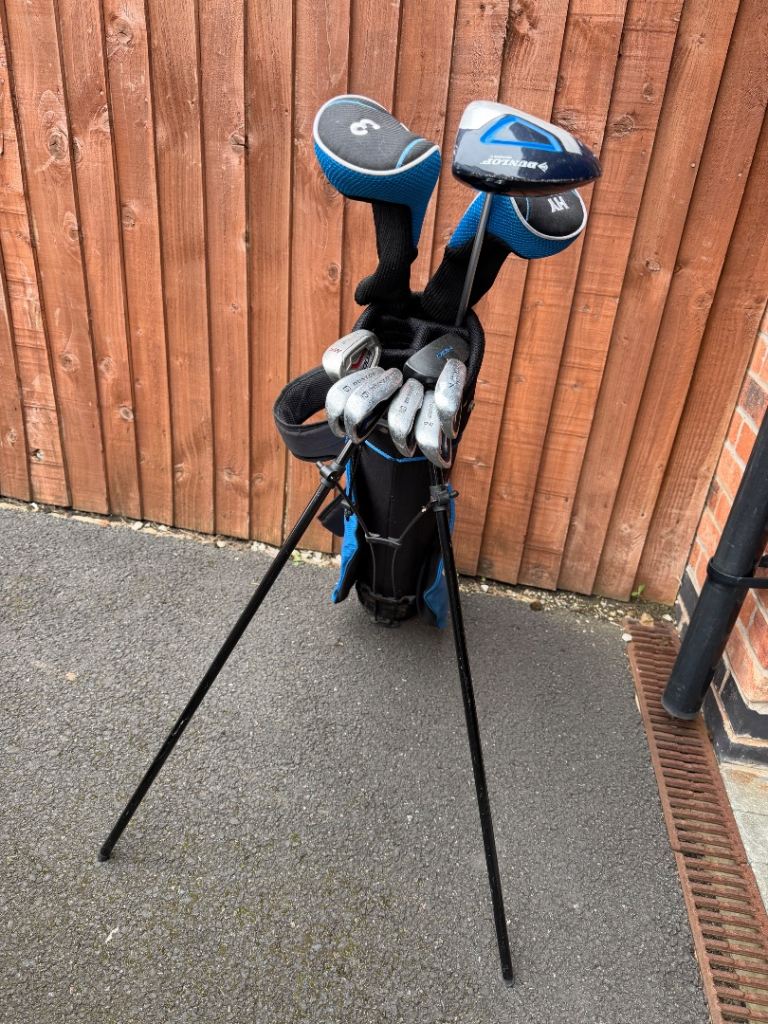 With a stand bag, a set of Dunlop golf clubs that will fit a teenager upwards. Three woods, six irons and putter, a good starter set for someone, collection only.