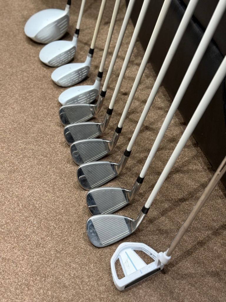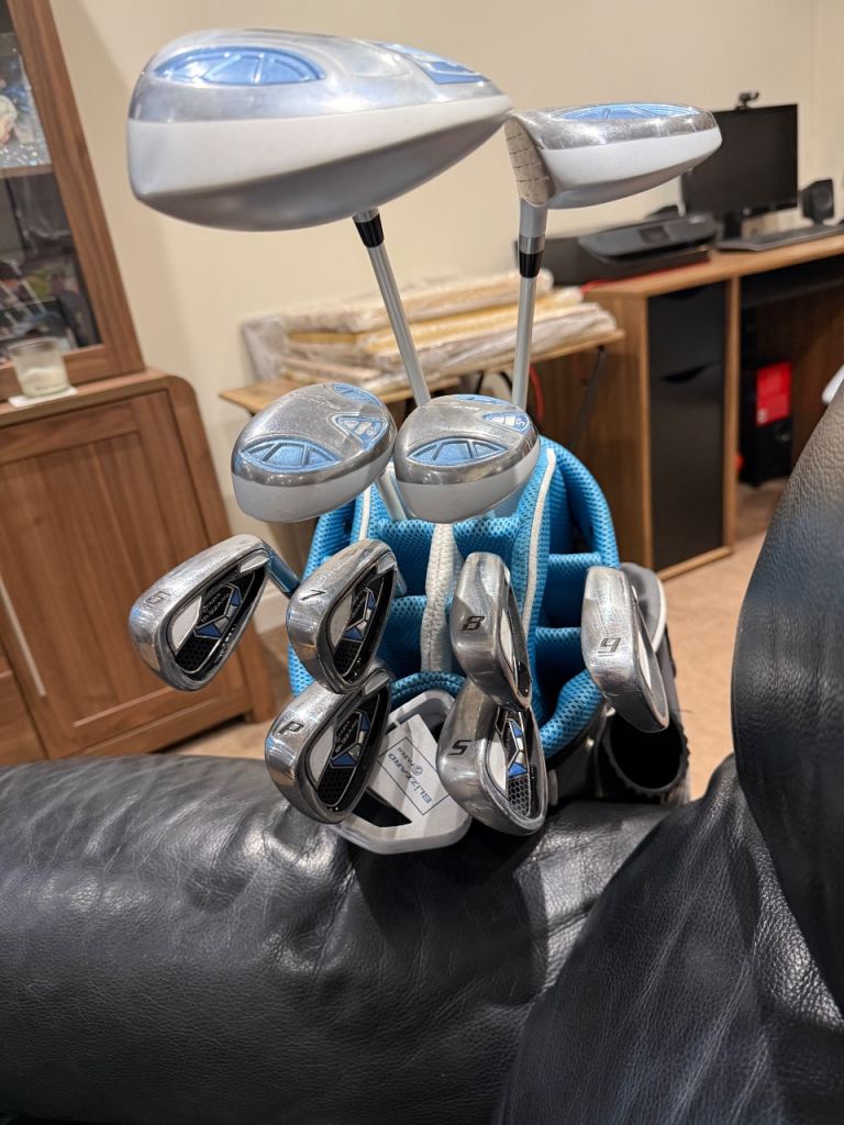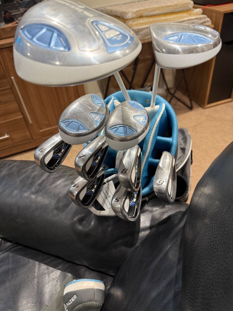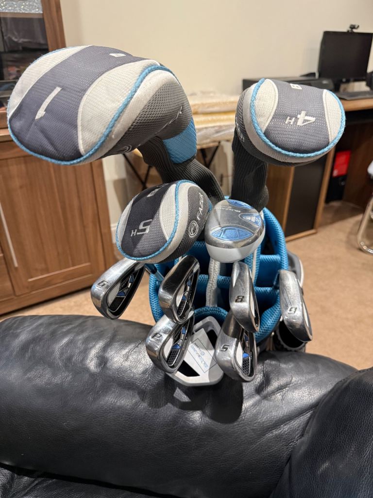 The set consists of a Driver, 3 Wood , 4&5 Hybrids Woods, 6-SW Irons and a matching set Putter. This Right Handed , Graphite Shafted set Comes with balls n tees and sits lovely in a Fazer CartBag which has all working zips n pockets. The bag also has a carry strap.