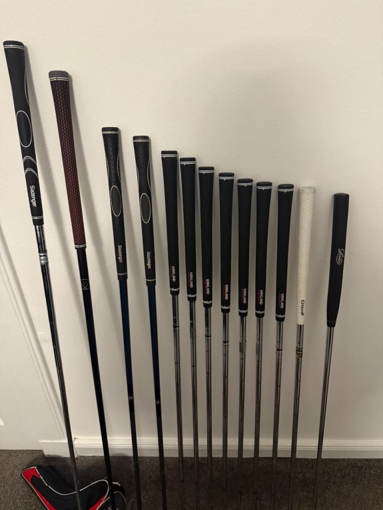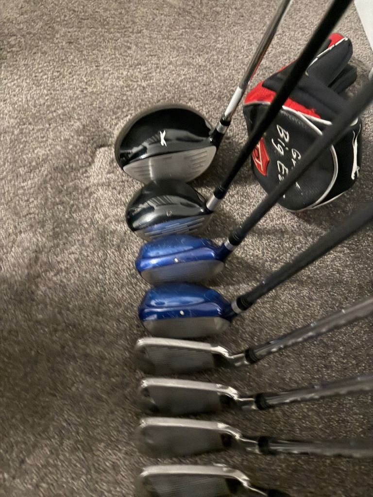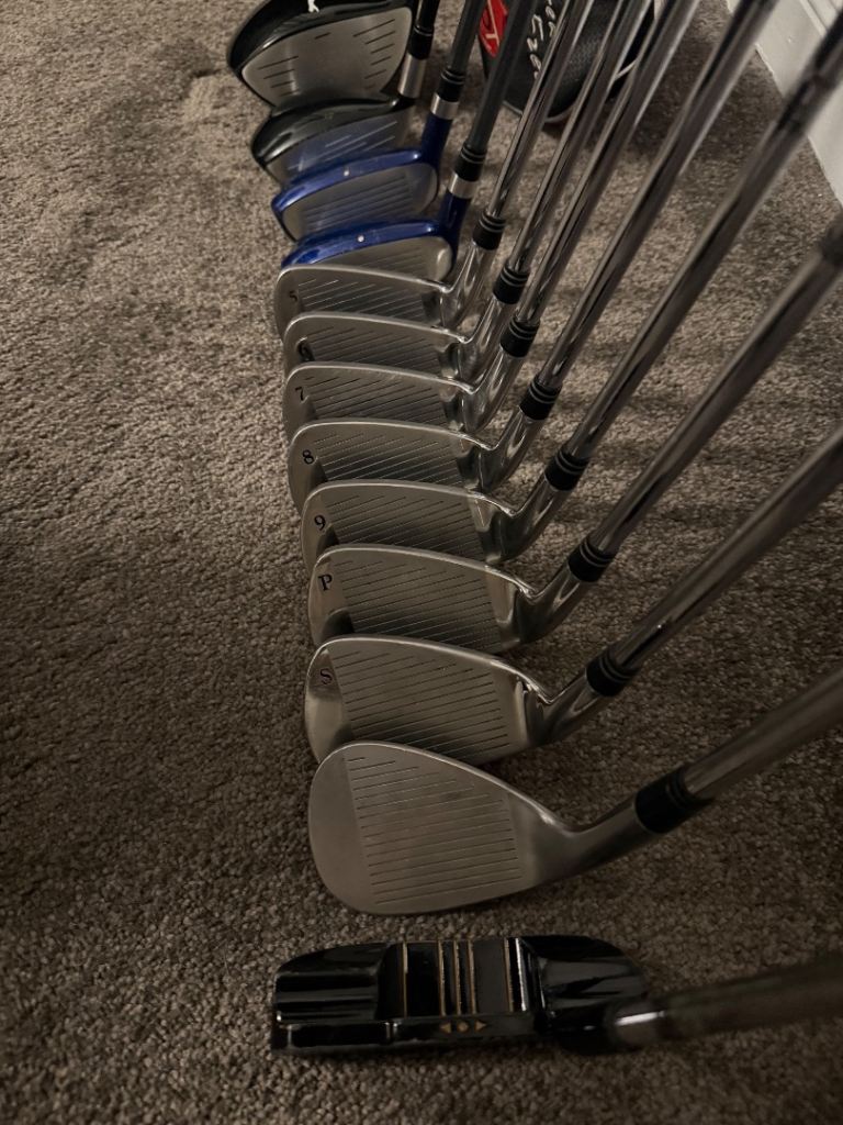 For sale this full set of 13 men’s right handed golf clubs all are regular flex and all very easy to hit forgiving clubs great for someone getting into the game with every thing you need to get going and last you a good while this set includes the Taylormade stand bag in very good condition unfortunately no rain hood all clubs are in very good/good condition this set includes