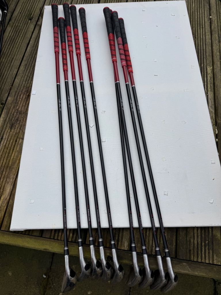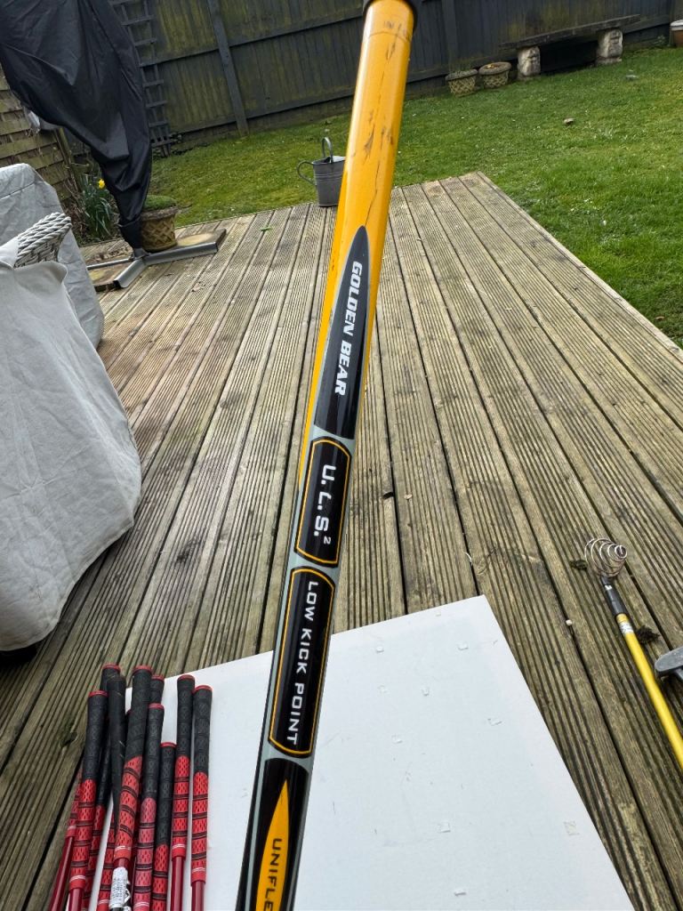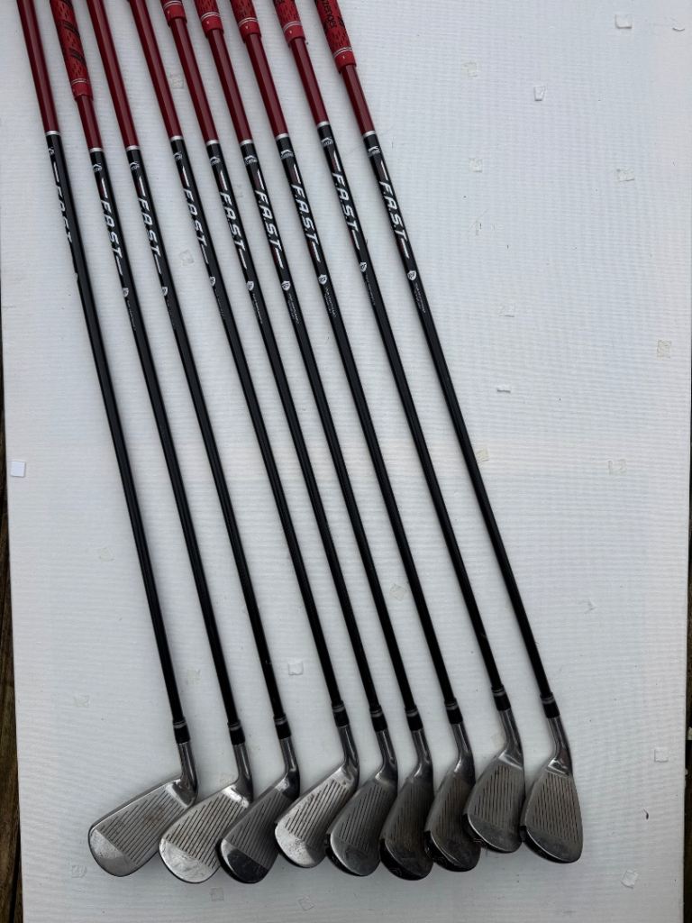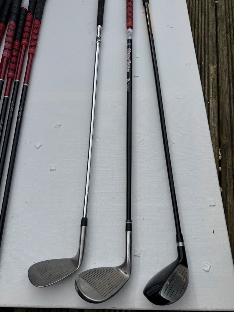 A full set of Slazenger FAST clubs ranging from a driving iron through to pitching wedge. Clubs 3-9 and also included in the bundle is a putter, sand wedge and Golden Bear hybrid driver. Decent condition