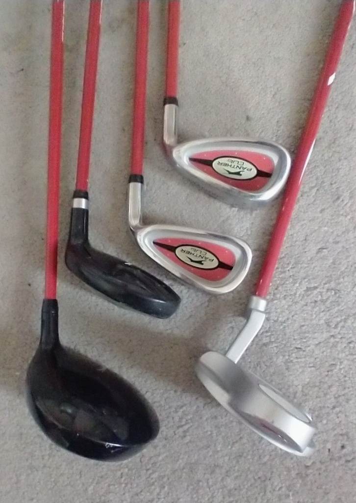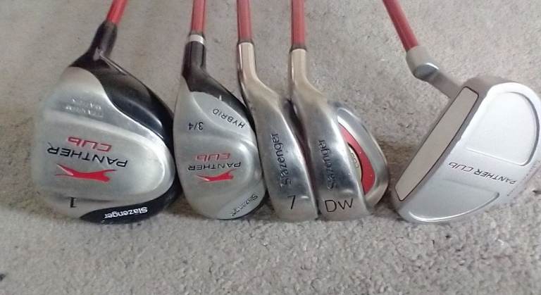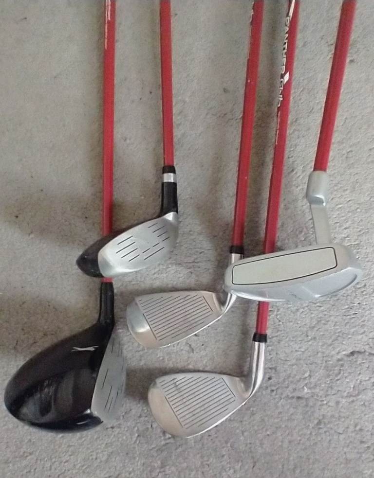 Slazenger Panther Cub Junior Clubs & stand bag. Graphite shafts. Original grips in good condition. All zips work on bag. Includes rain cover. Suit height from 3'9" to 4'0" See photos for general condition. Cash on collection £30
