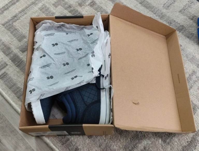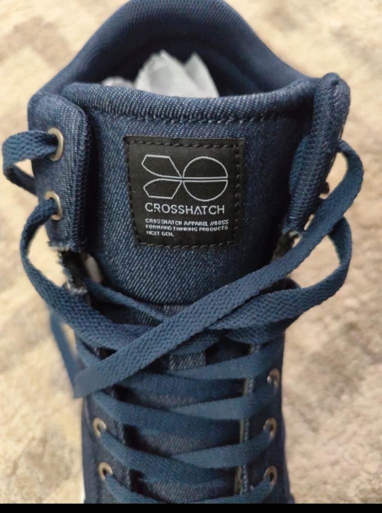 Selling these stylish Crosshatch high-top sneakers in a versatile navy blue denim-look finish. These are perfect for casual wear and pair well with chinos or jeans.