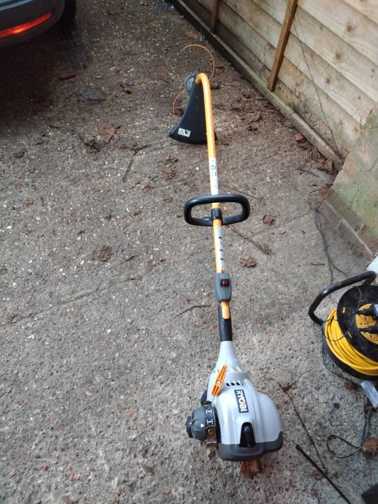 Petrol grass strimmer with twin line feed and protection guard needs a new primer bulb as it's split good condition