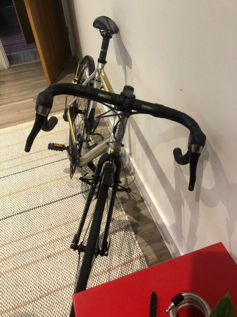 Medium 54 Gravel bike great on and off road used mainly on road and along seafront cycle path is quick and well made easy to change gear as gear shifters are with the brake levers stored indoors this is very well made bike built to last.