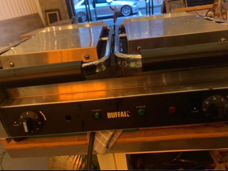 Twin heated plates with separate controls allow you to cook two items at different temperatures.