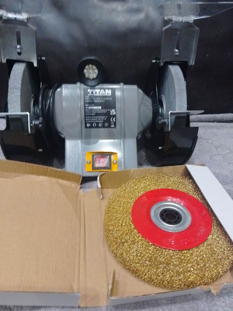 Titan bench grinder as new condition with work light and wire brush. Collection only.