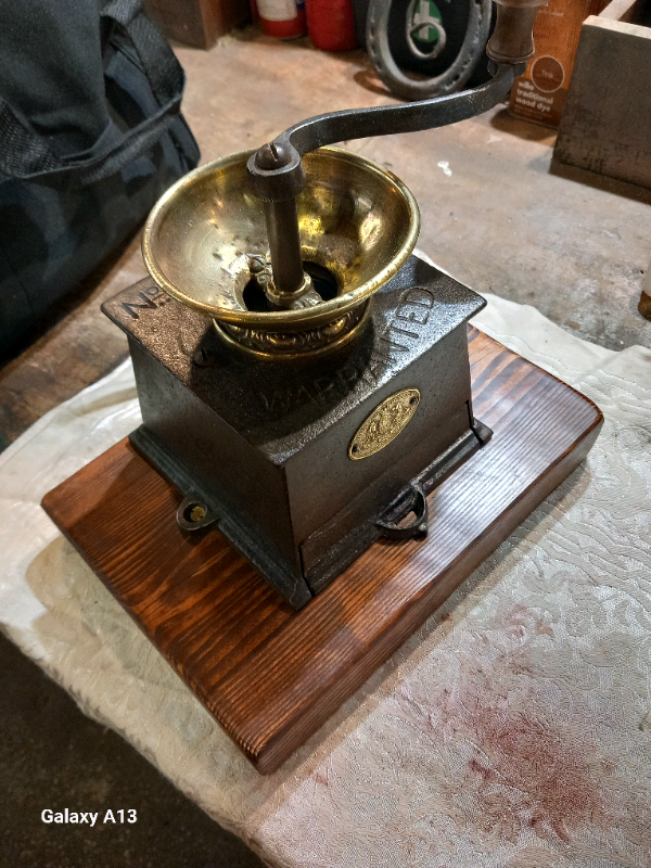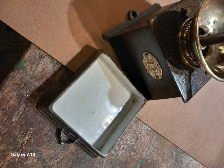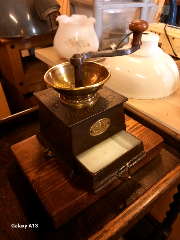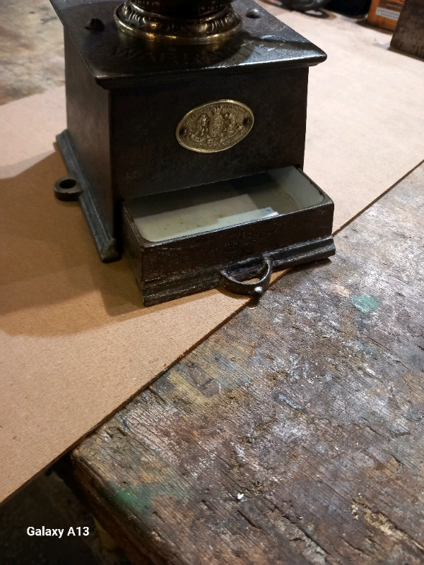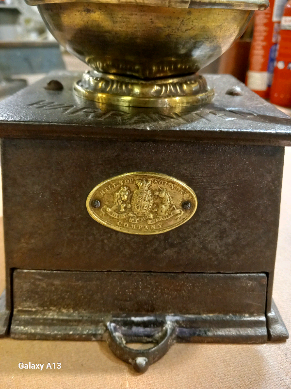 VINTAGE COFFEE GRINDER . WROUGHT IRON WITH BRASS BOWL , DRAWE AT FRONT , LOVELY PATINA , RETRO / VINTAGE , HILLTOP FOUNDRY COMPANY , WARRANTED NO. 3
