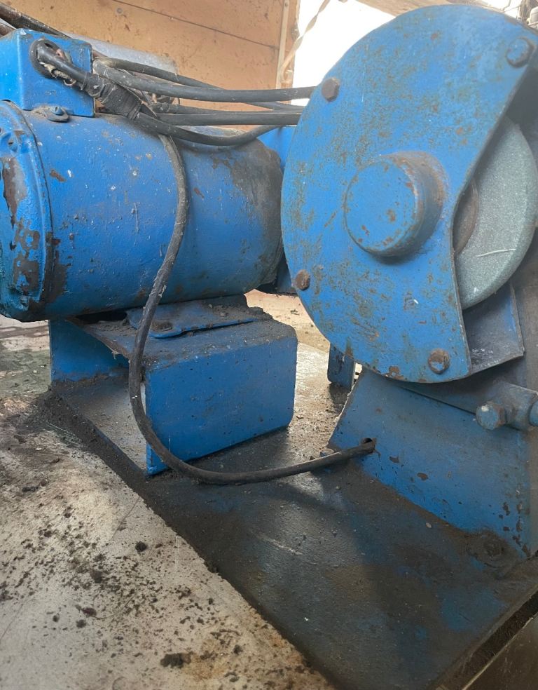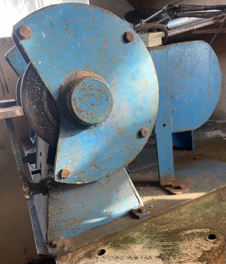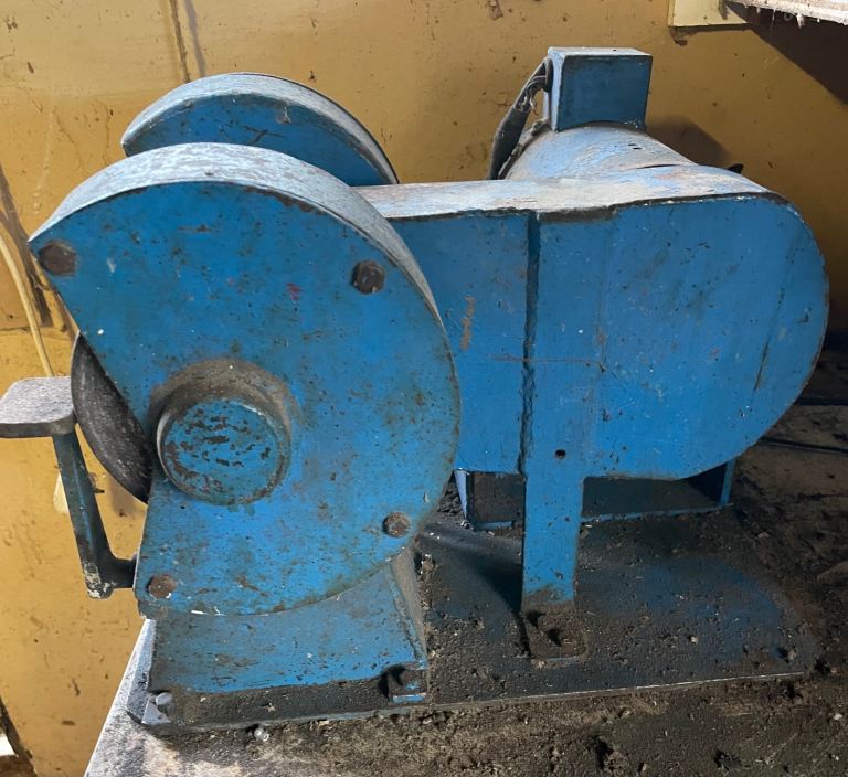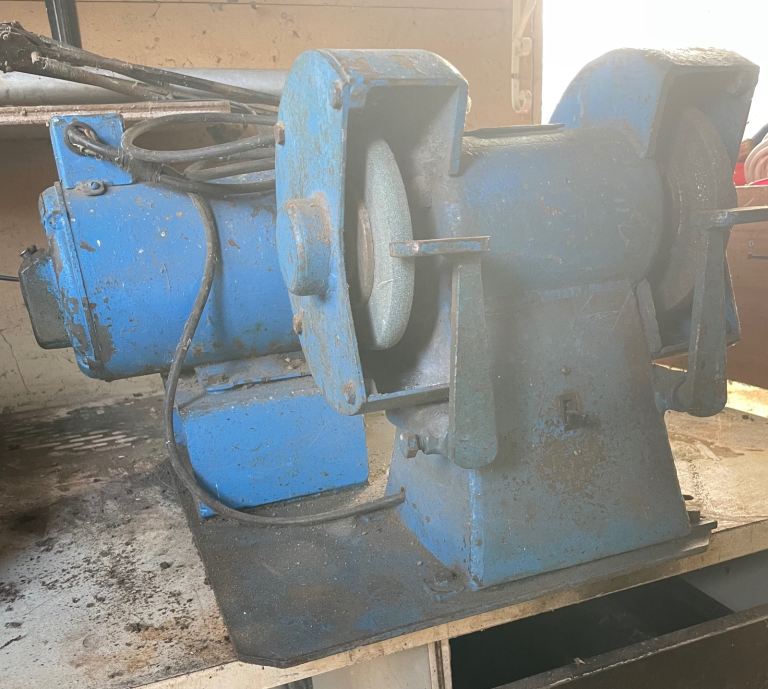 Sturdy metal construction, fitted with grinding wheels and mounted on a heavy base.
