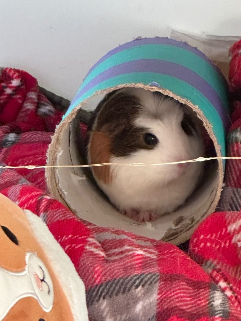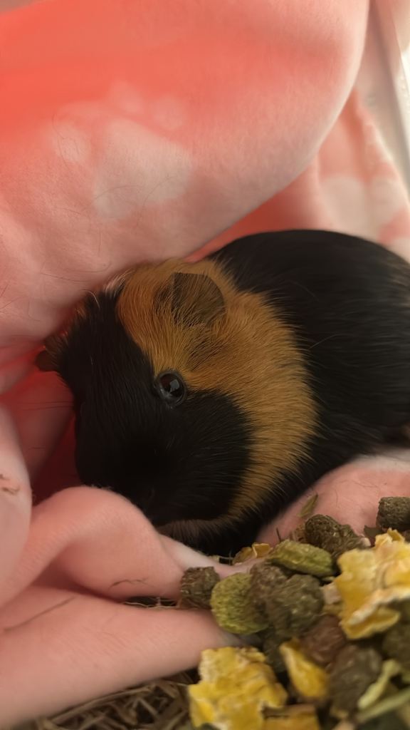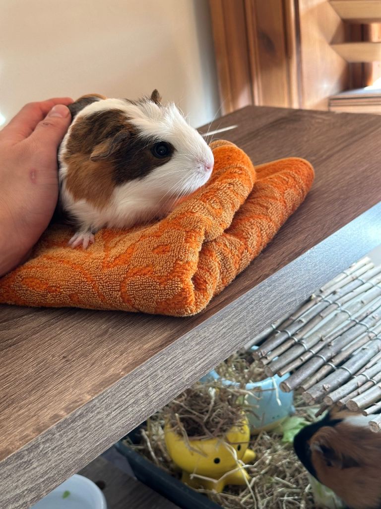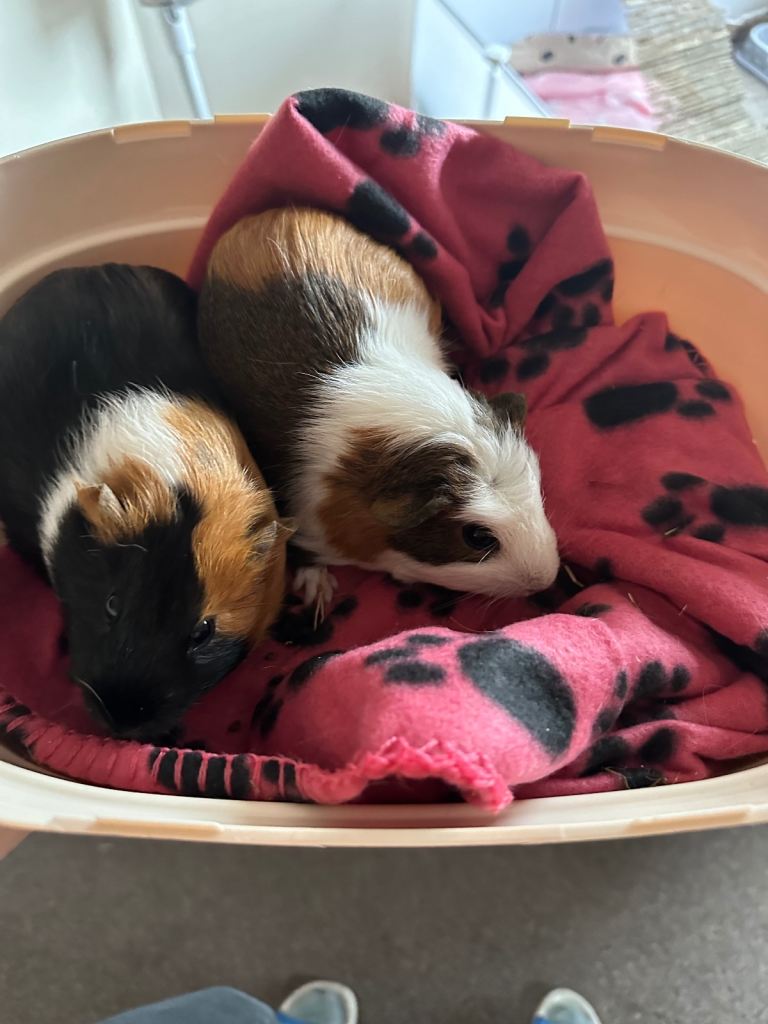 Pookie (white and brown), is more skittish and slightly smaller. She probably needs more handling and I’m sure she’ll get used to her new owners soon enough.
