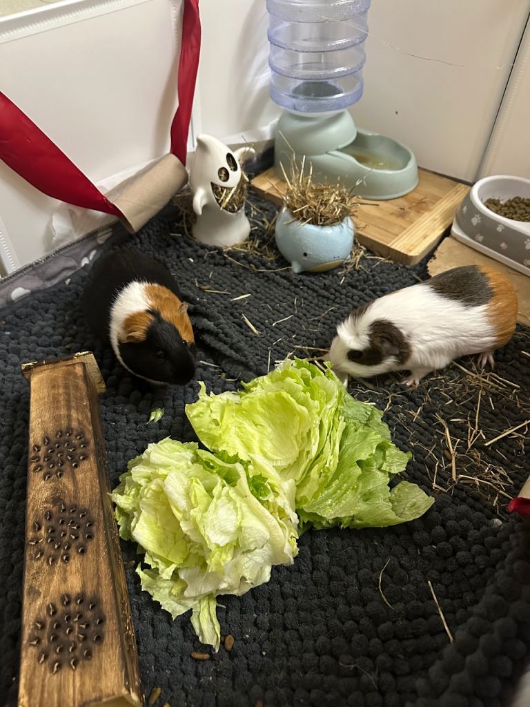 Bear (brown and black) is a lot less skittish and will happily come up to you to be fed by hand. She even likes a scratch on the head once she has her lettuce.