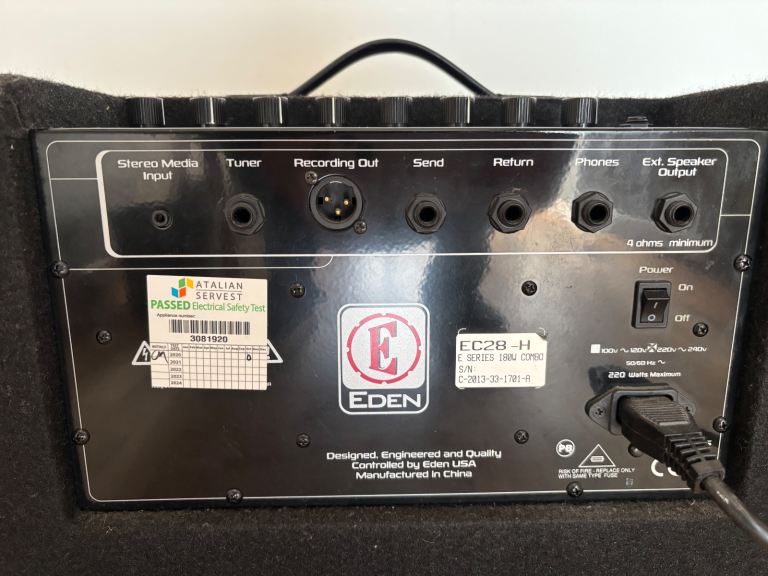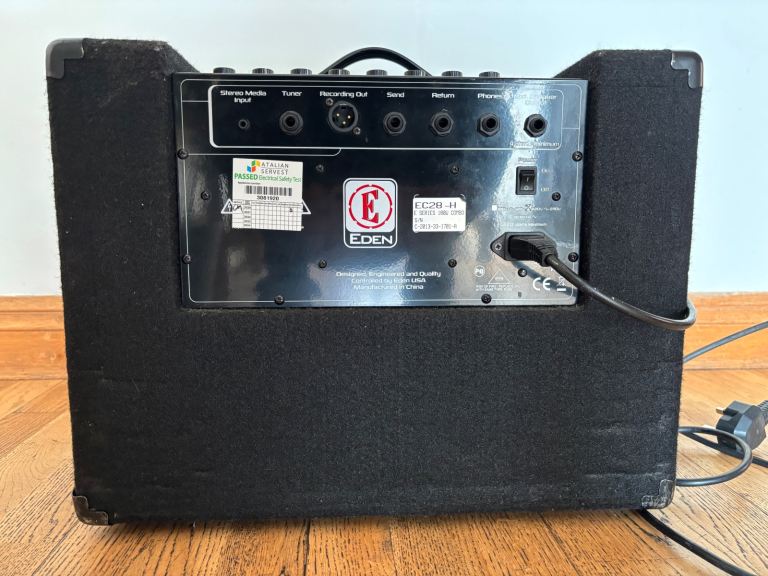 ‘EC28 with 2x8" speakers and 180W the EC28 is a easily portable and punchy practice amplifier. As well as the Eden’s "Enhance" control, it has an array of other useful features. 4 Stage EQ Bass, Mid, Mid sweep and Treble, Compressor with level control. It also contains 3.5mm jack socket (MP3), Balanced XLR output, 1/4" headphone jack socket, Effects loop, External speaker output, 1/4" tuner out.’