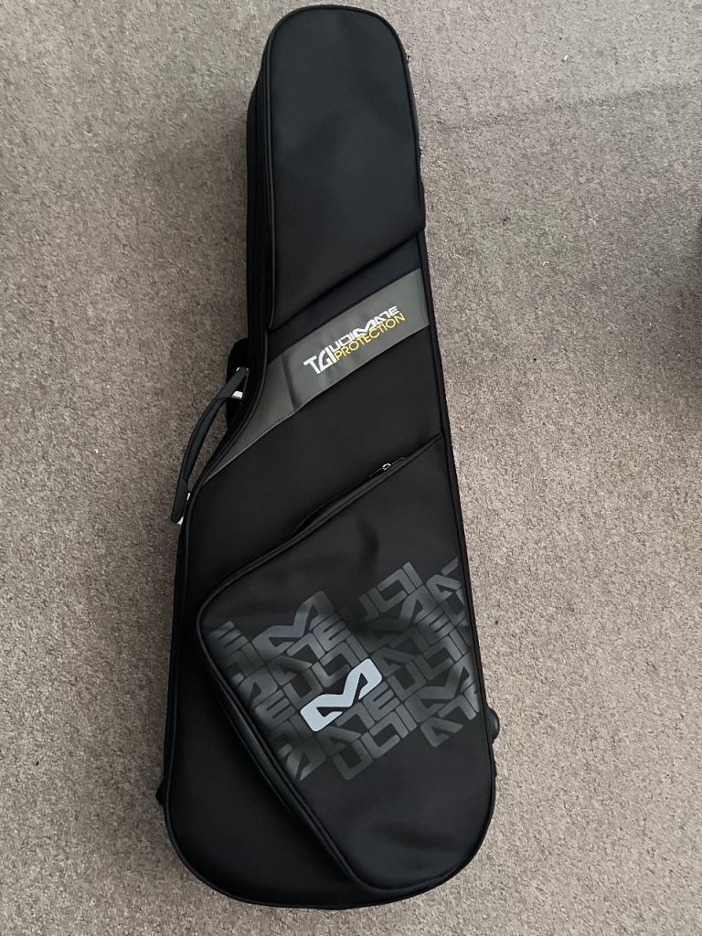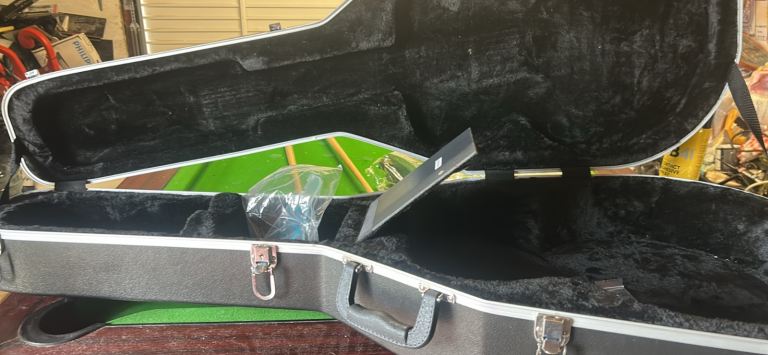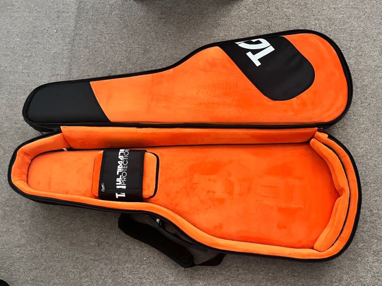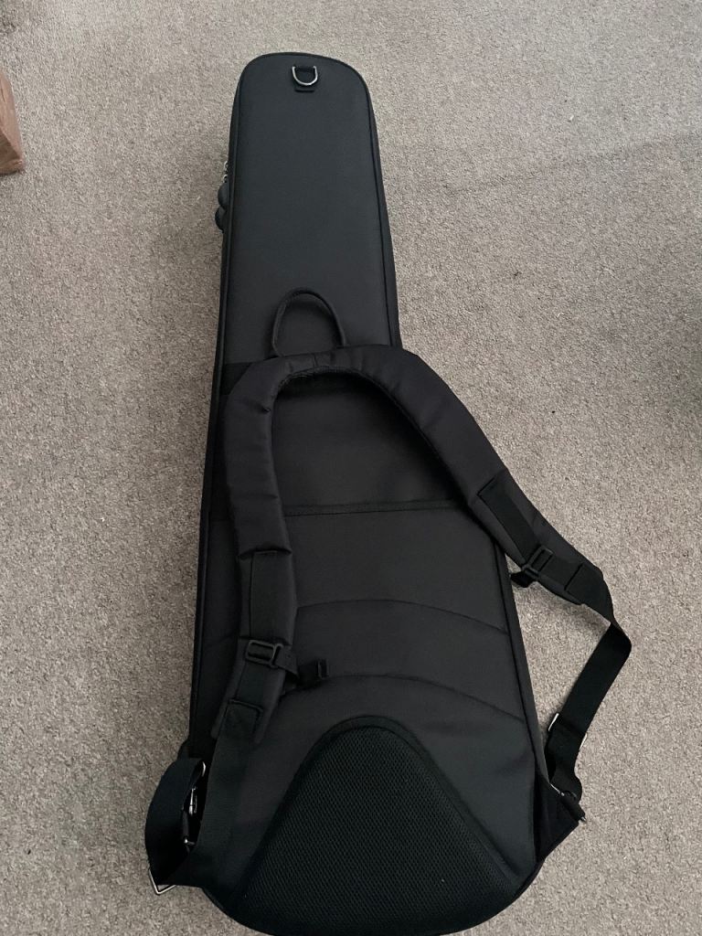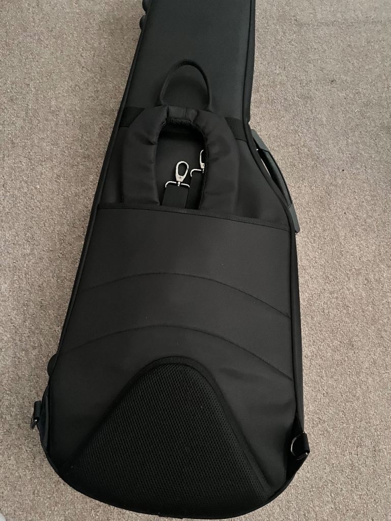Thick padded interior with guitar neck hold strap and lots of pocket spaces for storing paraphernalia.