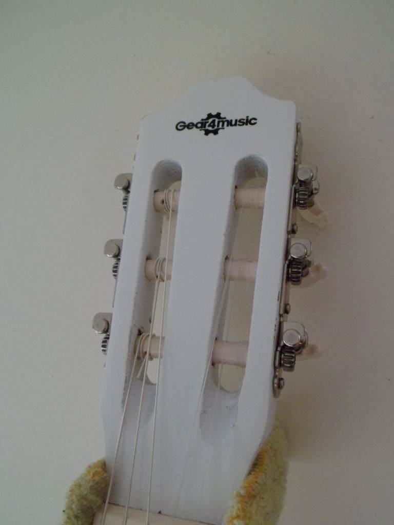 Here is a lovely nylon strung classical in unmarked gloss white .It has new strings and is almost unplayed . At only £35 its a bargain . Any trial .