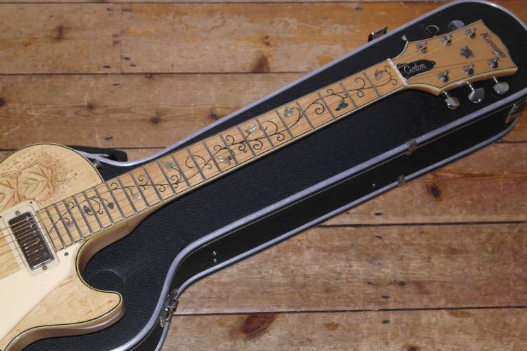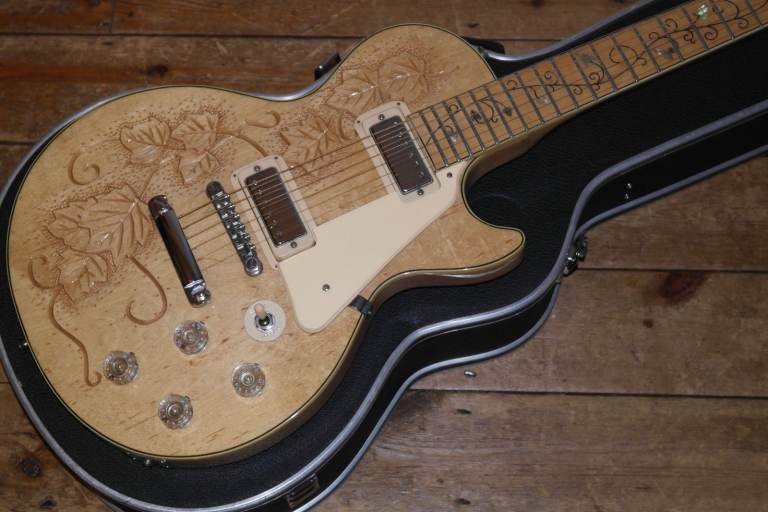 1976 Kasuga LG 2000 Les Paul Deluxe made in Japan carved vine leaf front, tree of life fingerboard, very good condition with original case, swap for other quality guitar or sell £1295.00.