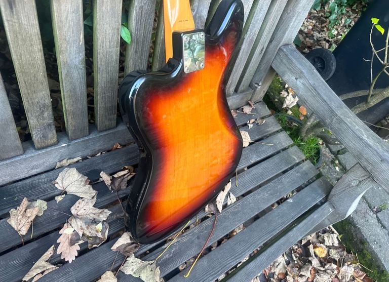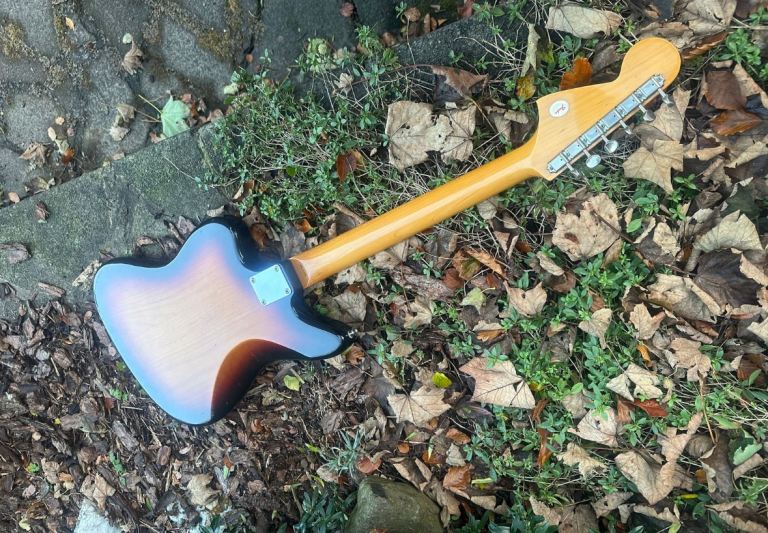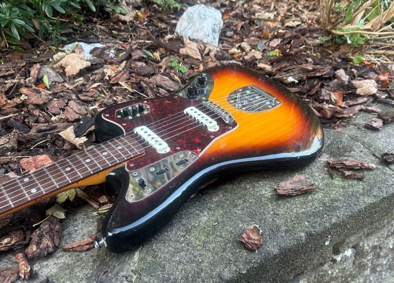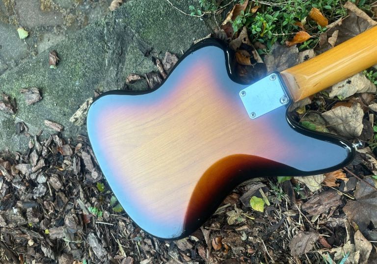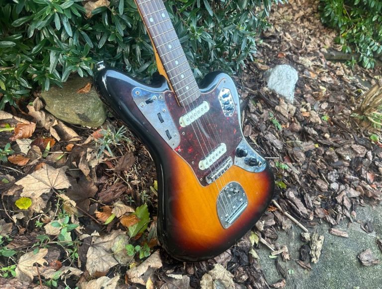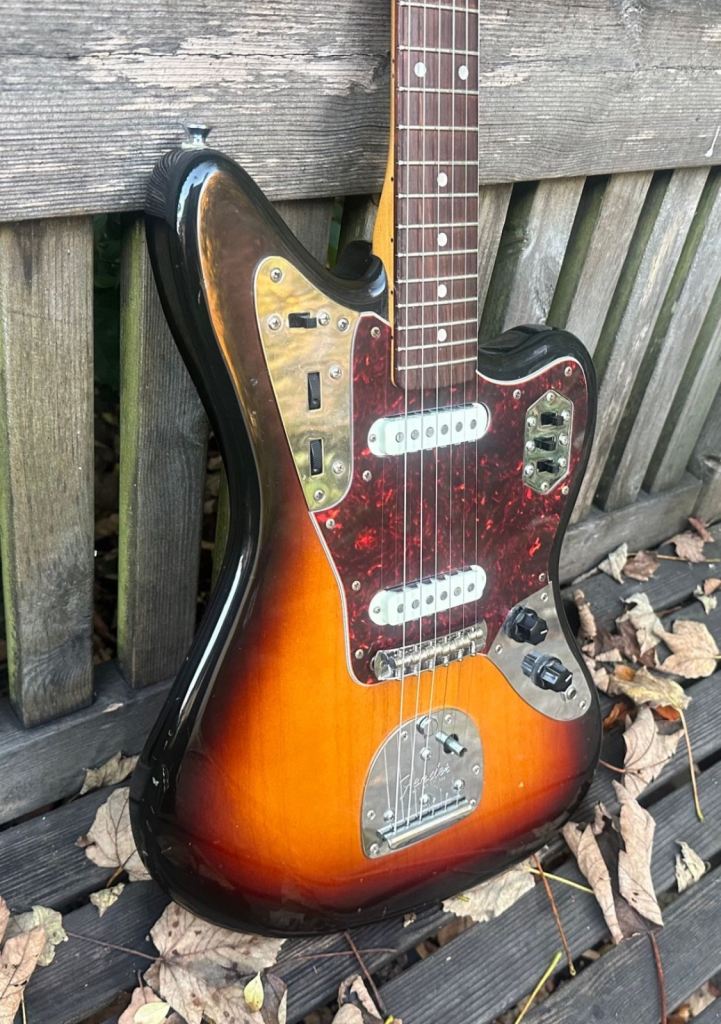 Has been played and shows play/fret wear and dings but overall very good condition for age. Has a Mustang bridge and genuine Fender AV65 pickups. Looks amazing and plays great - grunge era Jag!