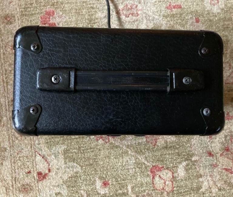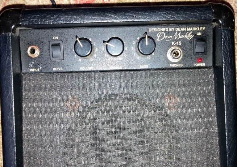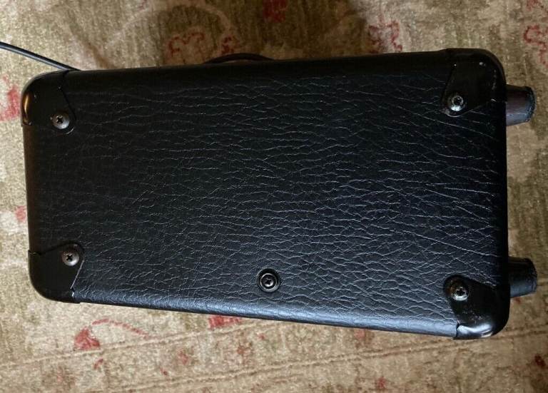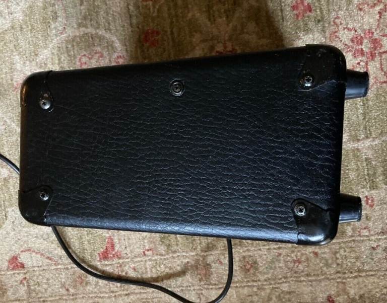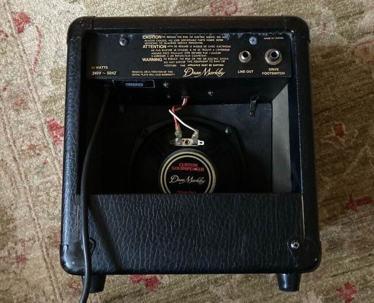 Compact combo (29cm H x 26cm W x 13cm D) in very good condition and full working order. Quite loud, especially when using drive switch (sound is more overdrive than high-gain). Front panel: input; drive switch; volume; treble; bass; headphones output and power switch. Rear panel: line out and drive footswitch jack (switch not included).