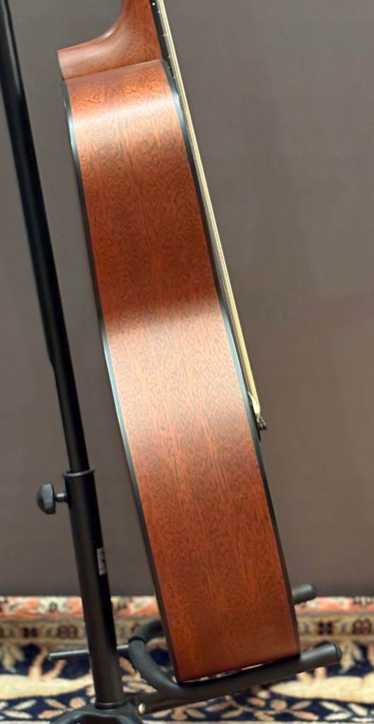 The body is made of Mahogany back and sides, X-braced with Spruce bracing, and a Spruce sound board on top. The back and sides are matt finished, whilst the top has a gloss finish (giving the GT in the model number). The selected hardwood neck has a 20 fret, 16” radius, Black Richlite fretboard with dot inlays.