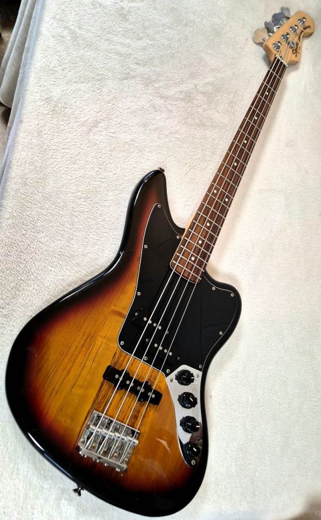 2011 Fender Squier VM Active Jaguar Bass Special finished in three-tone Sunburst.