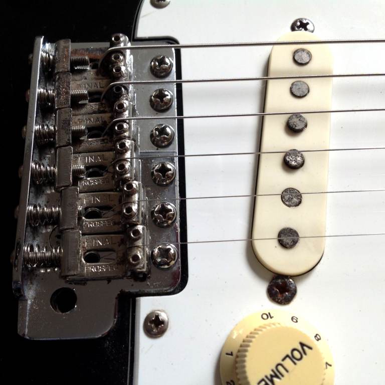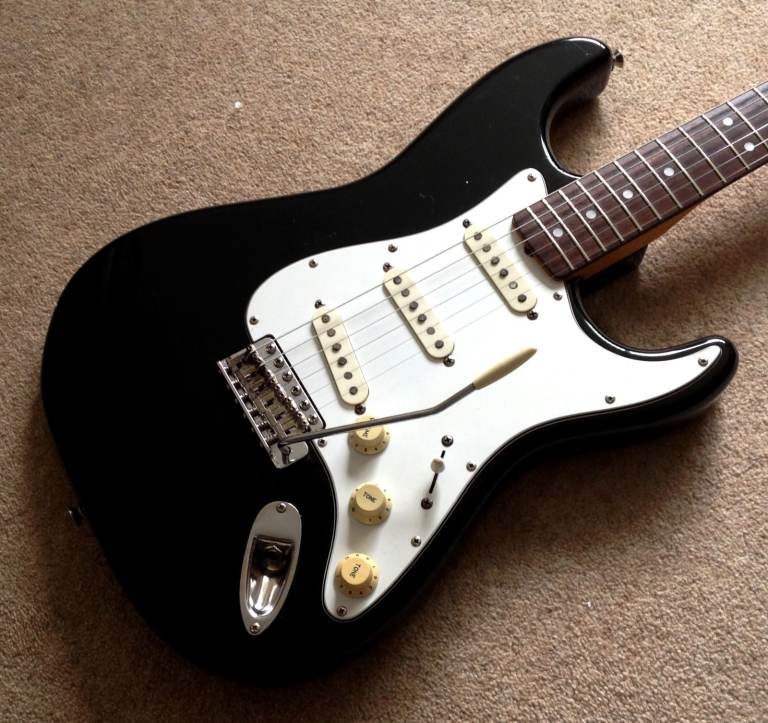 1986 Tokai Goldstar Stratocaster Black electric guitar Made in Japan in great condition although there are marks on it, as is to be expected on a FORTY YEAR OLD GUITAR. There is a square patch of bare wood on the back of the guitar which can be seen in the pictures. The guitar has not been modified and has the original Grey Bobbin VII pickups, Deluxe Tuners/Machineheads together with the rare Final Prospec bridge saddles, one of which is very rusty. It also and comes complete with its tremolo arm. It is a brilliant guitar and has just been restrung with D`Addario 9-42 strings. Please let me know if interested. OPEN TO SENSIBLE OFFERS ONLY with CASH ON COLLECTION ONLY, WONT POST or DELIVER.