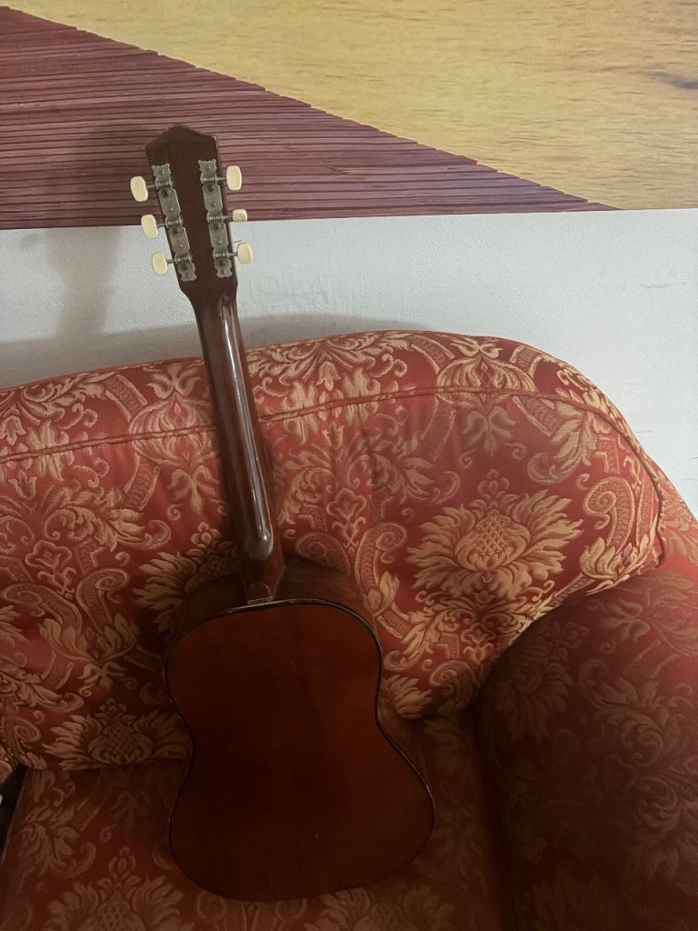 Here I have a acoustic guitar and it plays ok but it is missing 1 string as seen in photos and it is snapped where the top and bottom part meet but it can be fixed with wood glue but I don’t have any but if you do you are more than welcome to buy it,