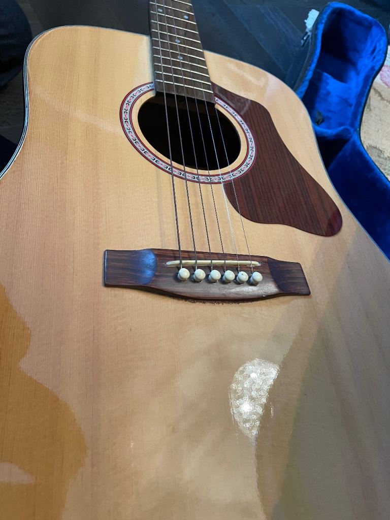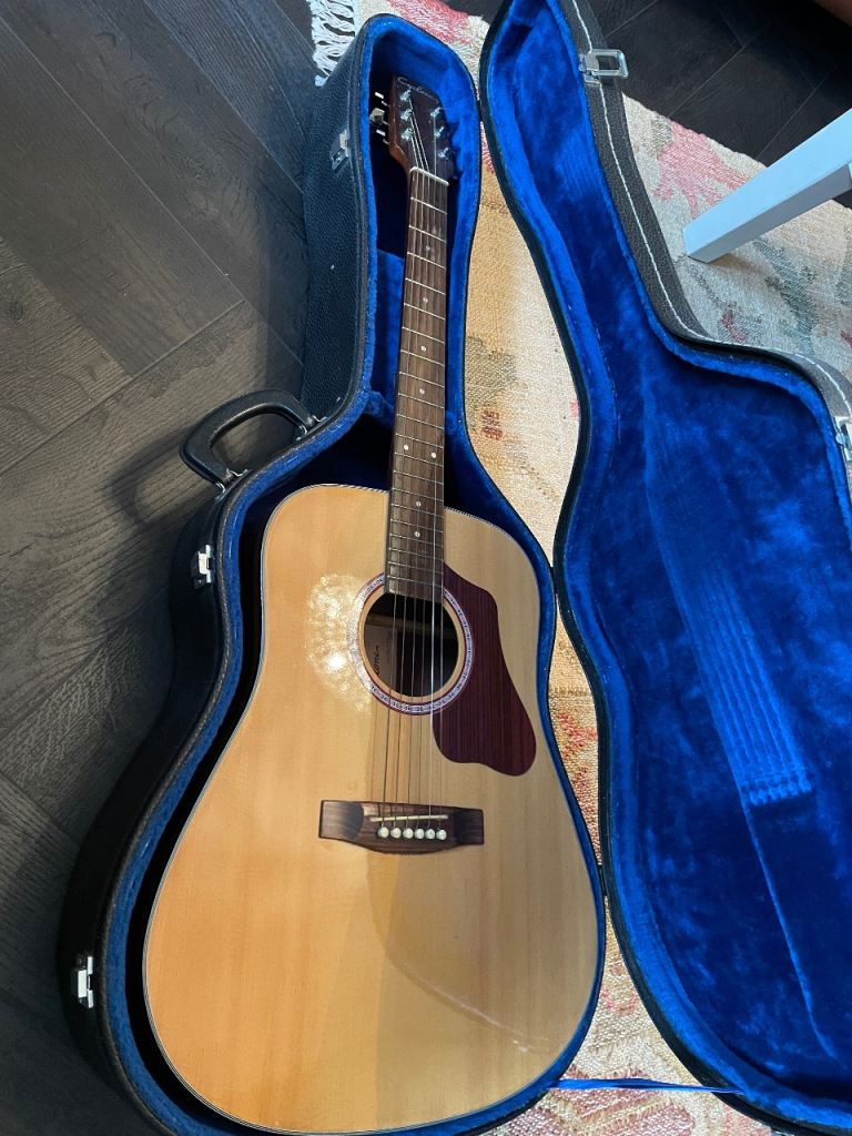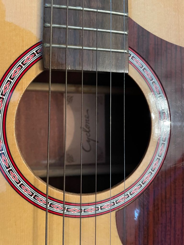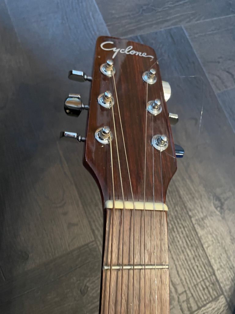 “Cyclone” acoustic guitar for sale, body in great condition, no scrapes or scratches. Right-handed with 6 metal strings producing great sound with lovely tone. Classic body shape. 41 inch long. Comes with correct sized solid carry case with blue velour lining. Cash on collection only please.