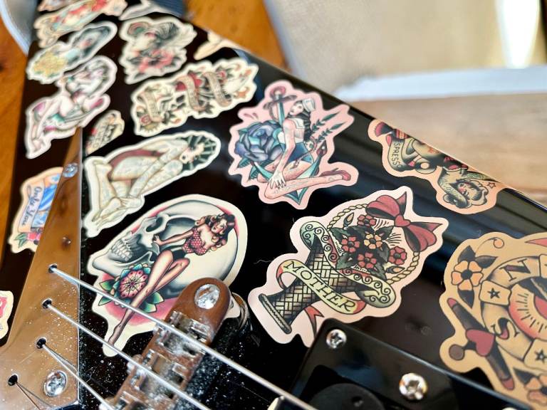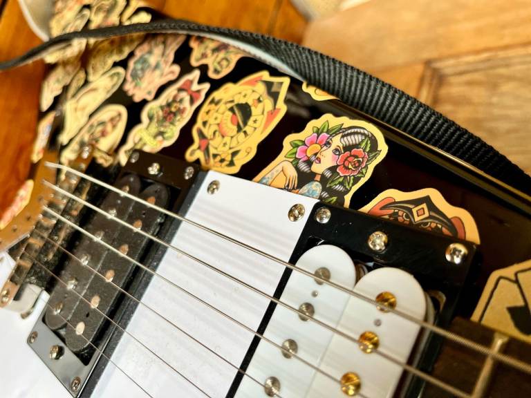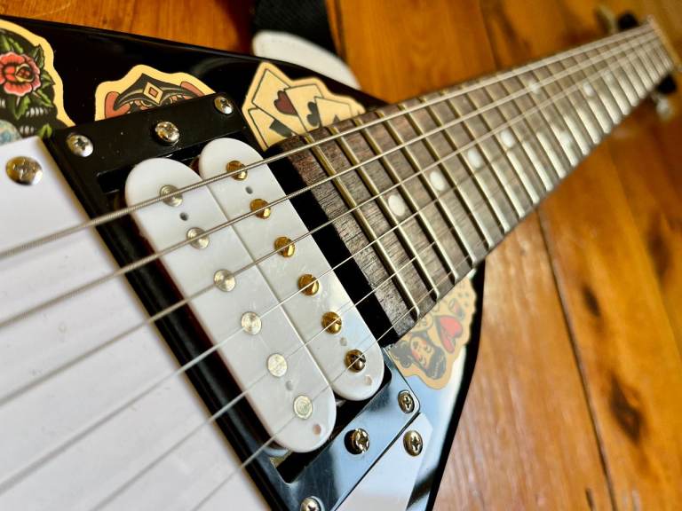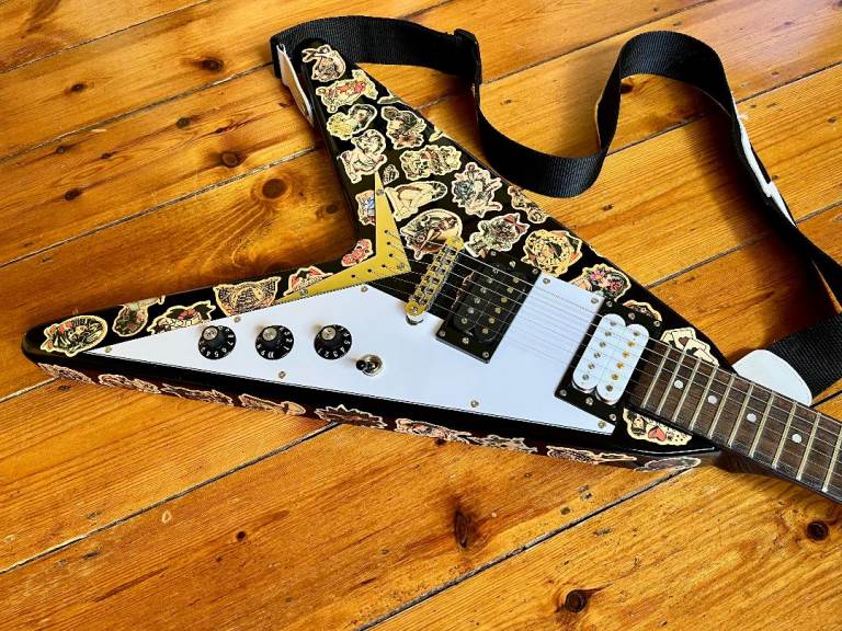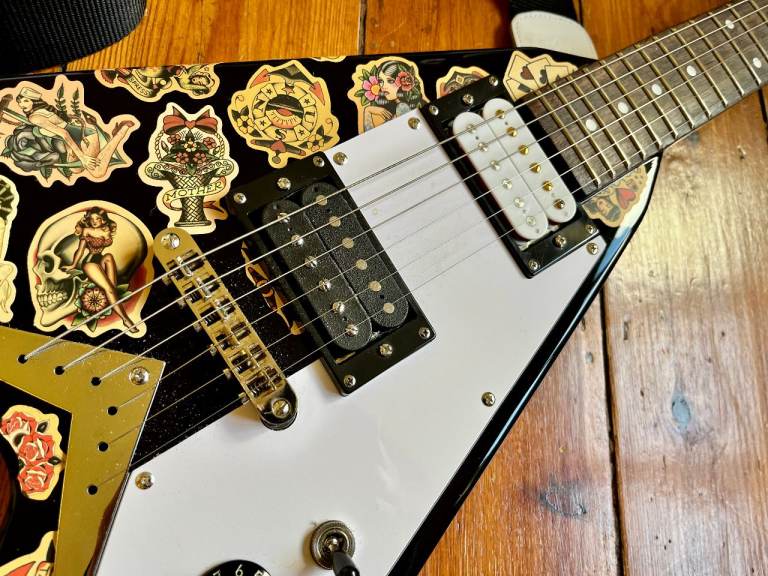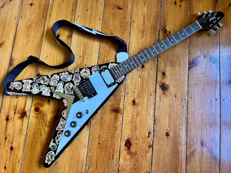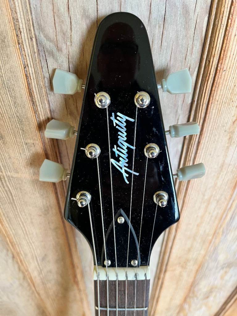 Really good condition Antiquity Legends Flying V guitar. A very fine copy of the Gibson '58 version, with fat neck, thru body stringing and pickguard shape. Great sounding pickups too. Set up with a low, comfortable playing action. I added the Tattoo stickers and witch hat knobs... just to make it more aesthetically pleasing! Everything works as it should... frets in great shape... really stable tuning... A no-issues guitar... A rock 'n' roll guitar! Have a look at my other guitar related items for sale too!