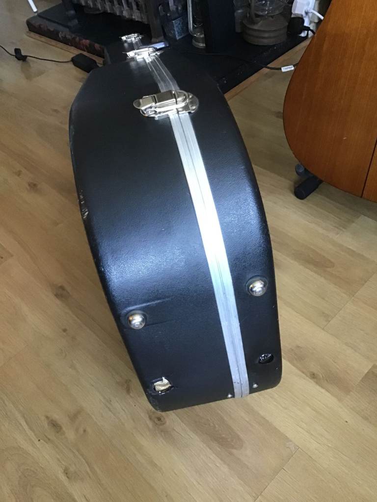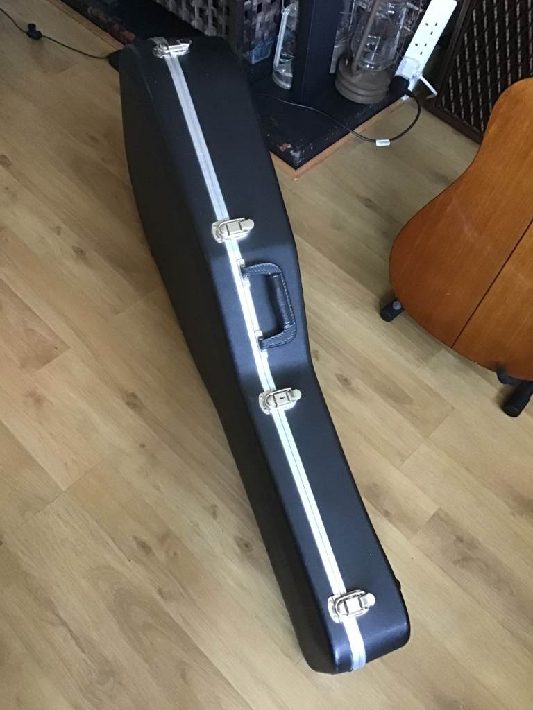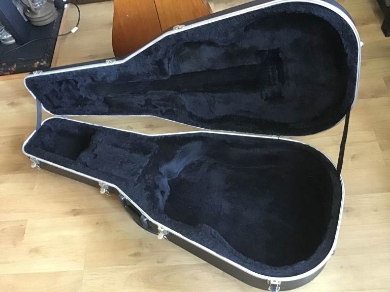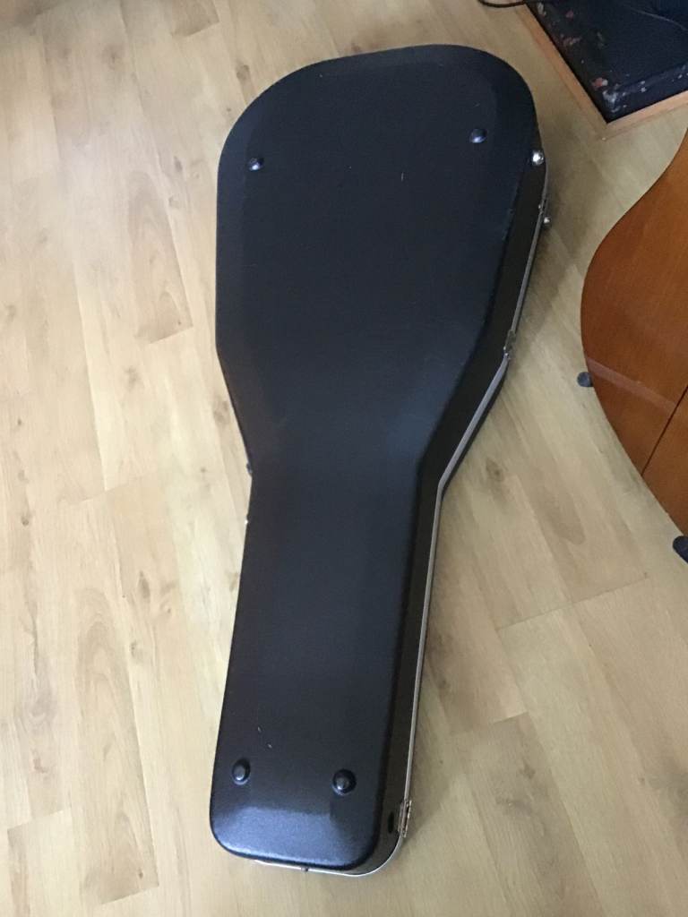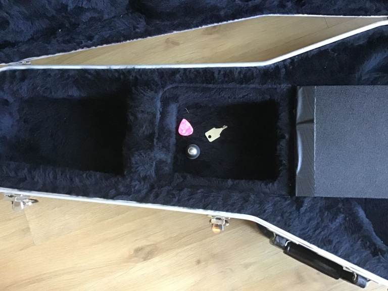 The guitar comes a case with keys, but it has two floor mats that are torn. The interior fabric is in good condition. A strap is included with the guitar.