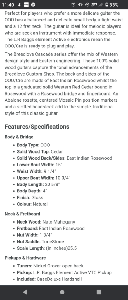 Stunning, sought after and quite rare 2012 Breedlove acoustic guitar in excellent condition. All solid woods with Western Red cedar top and East Indian Rosewood back and sides, very high spec guitar all listed in last pic. The guitar sounds, plays and looks beautiful. This is a lot of guitar for this money and a very reluctant sale indeed!!