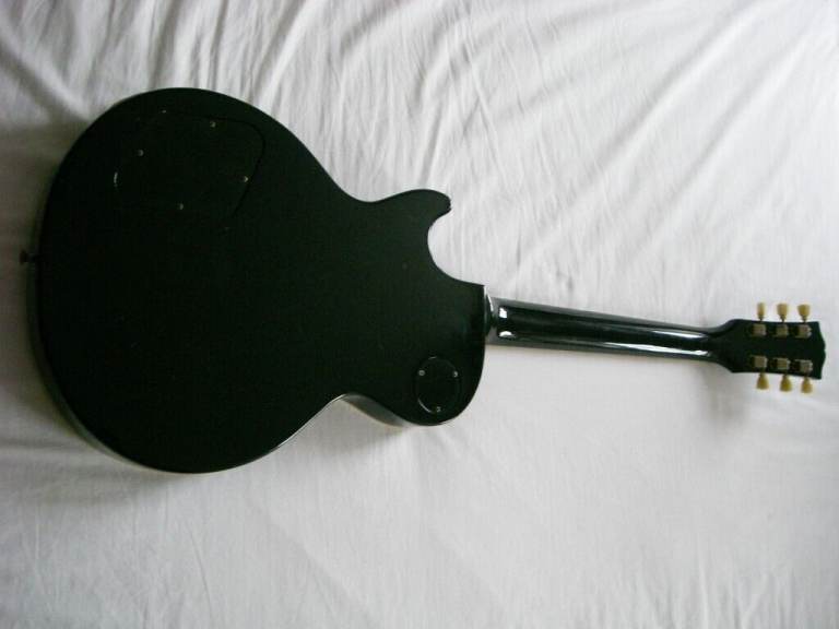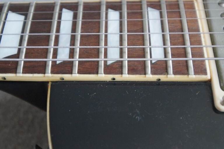 Rosewood fretboard with typical LP layout. 2 humbuckers a quartet of controls plus selector.