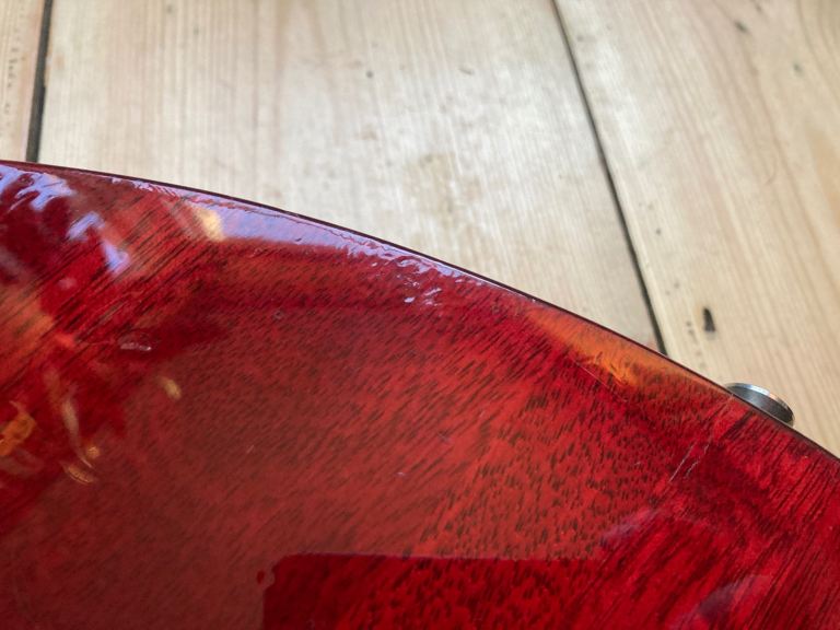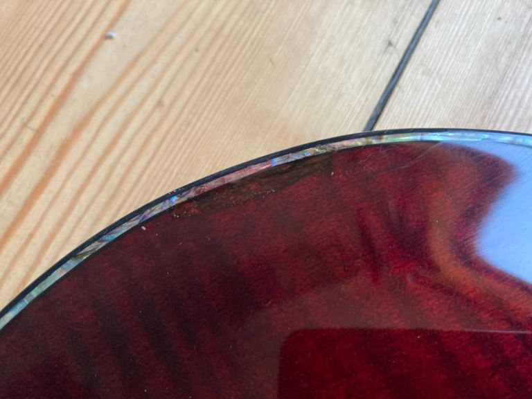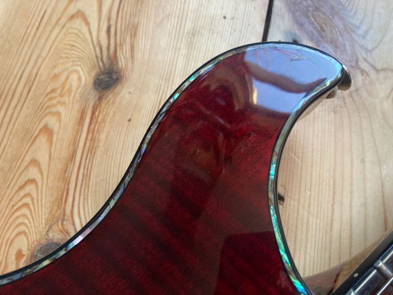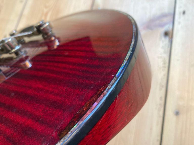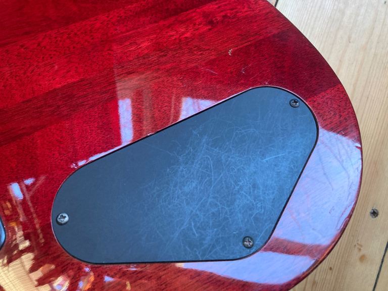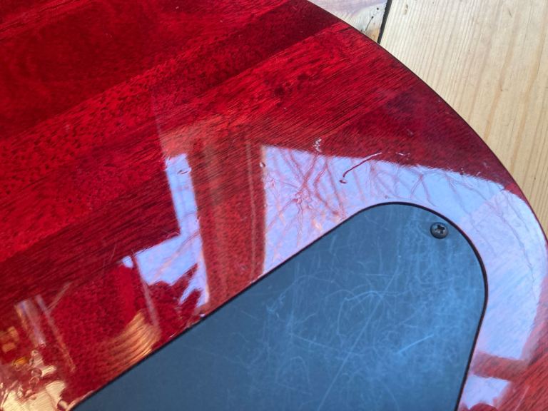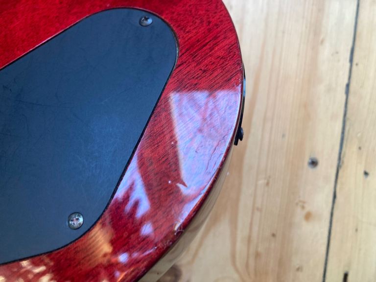 It's in used, pre owned condition, there are several small indents, buckle rash, a small light surface mark on the side of the neck , one larger indent on the front top edge has been repaired and refinished by our repairman, its impossible to hide so its an honest repair. The hardware is tarnished in places. This is a pre owned guitar.