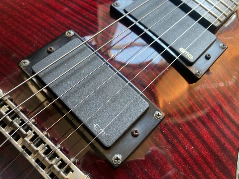 This DC-1 features a gloss dark red finish , highly flamed top , black chrome hardware with twin active EMG humbuckers (9v battery required), 3 way switch and master volume and tone controls and lightly finished feeling neck and locking tuners.