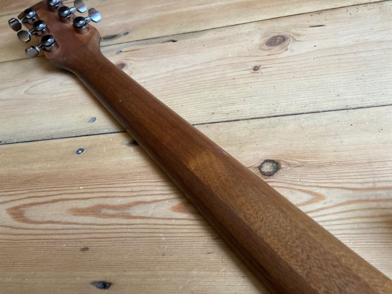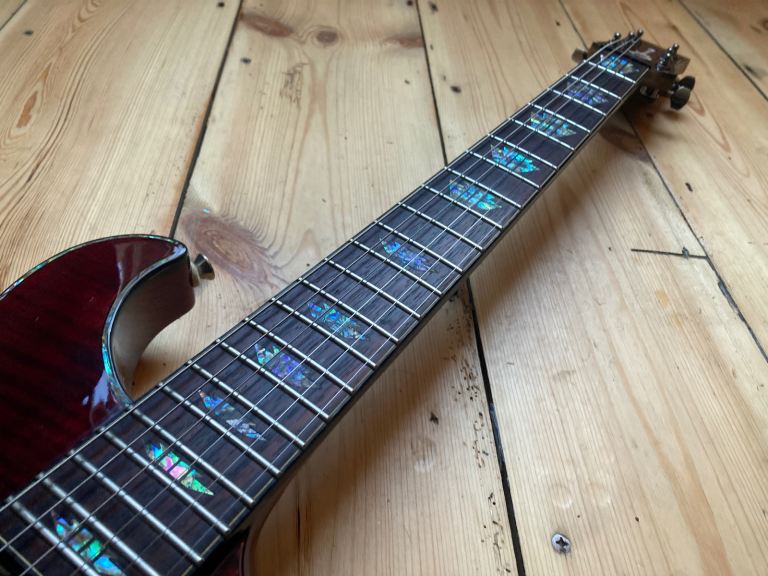 It also boasts a 24 fret double octave neck / fretboard with interesting trapezoid type fretboard abalone inlays and matching headstock.
